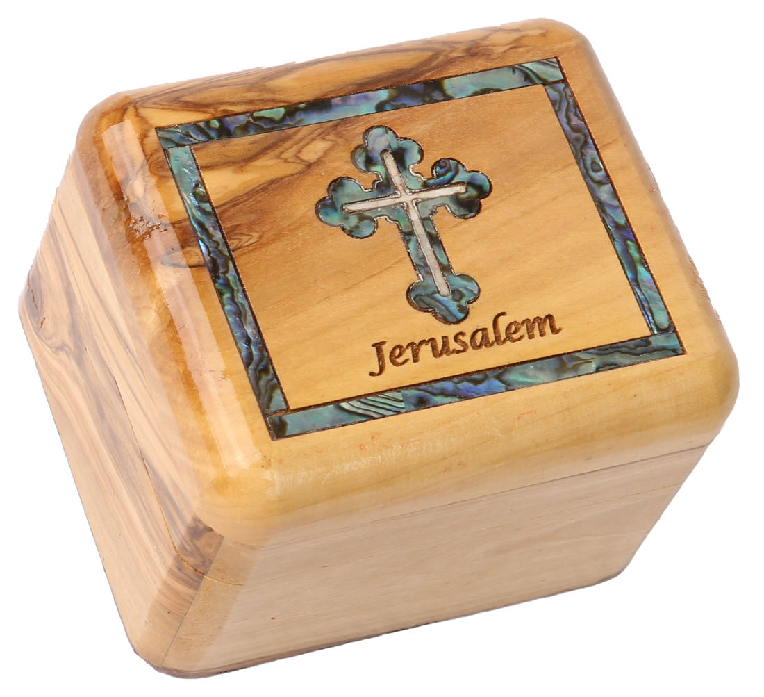 Olive Wood Box_ Mother of Pearl Broder and Roman Cross