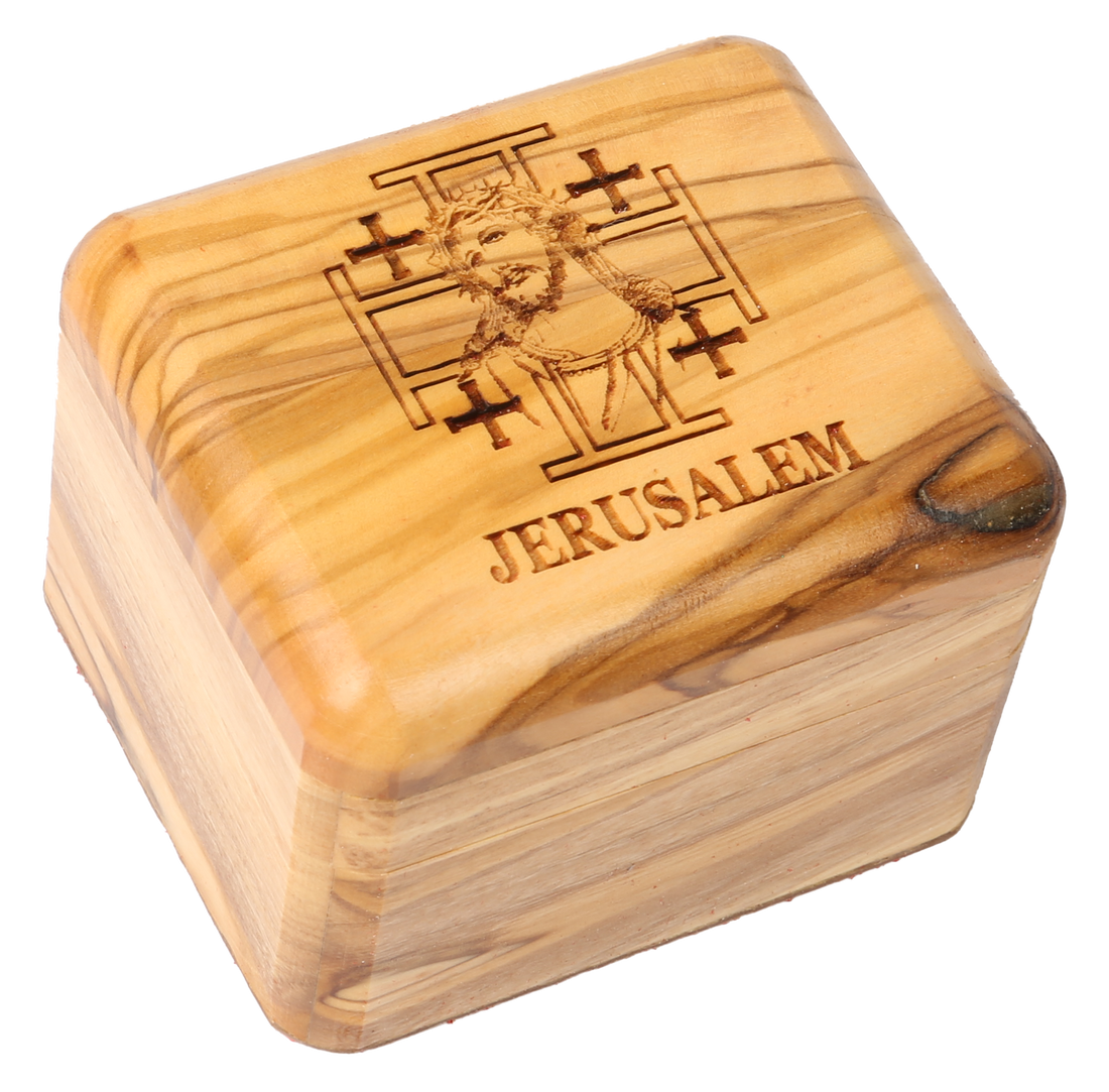 This olive wood box features a laser-engraved Jerusalem Cross and the face of Jesus, combining...