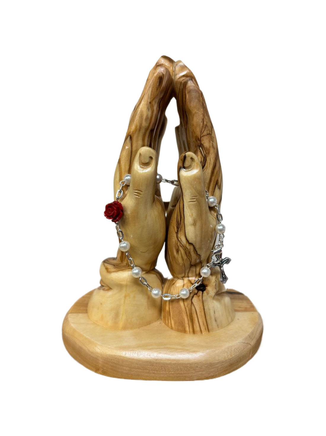 White Pearl-Style Rosary Bracelet with Red Rose Accent and Silver Crucifix