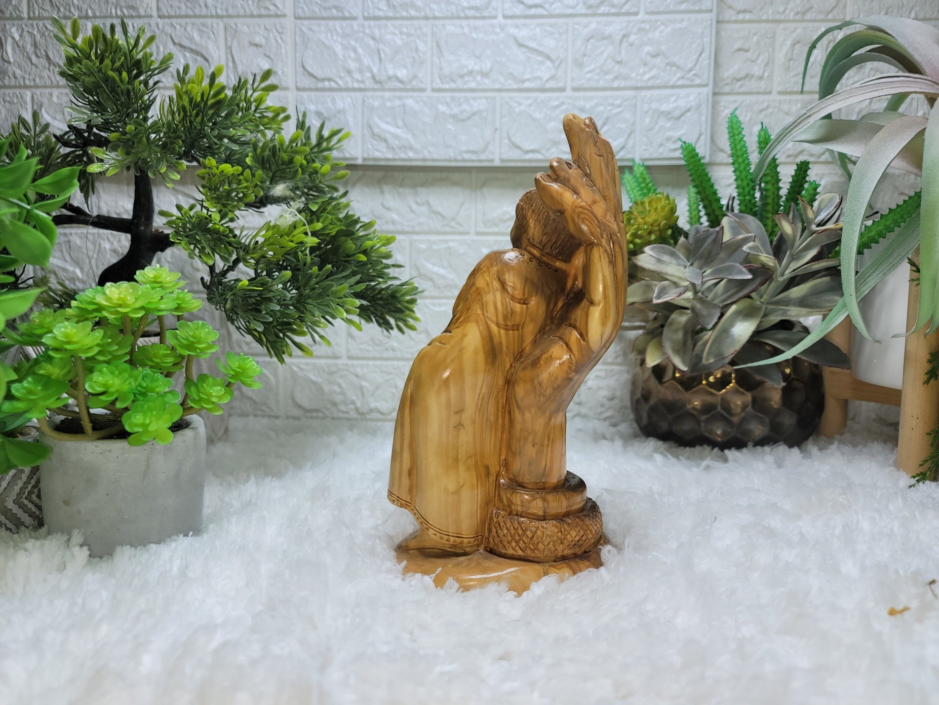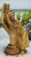 This carving depicts a figure, often interpreted as a baby or a representation of humanity, cradled within a large hand,symbolizing the "Hand of God". The piece is associated with the Holy Land Community Online Store and is tagged with terms like Bethlehem, holy, Israel, and Judaica, suggesting a religious or spiritual significance. The concept is inspired by the biblical verse Isaiah 49:15, "I have carved you on the palm of my hand," conveying a message of divine protection and care.