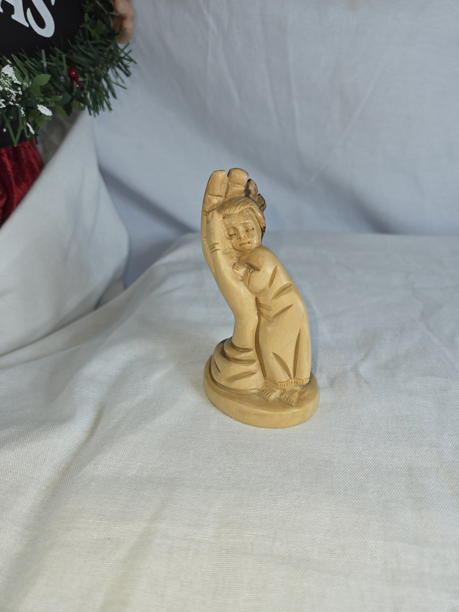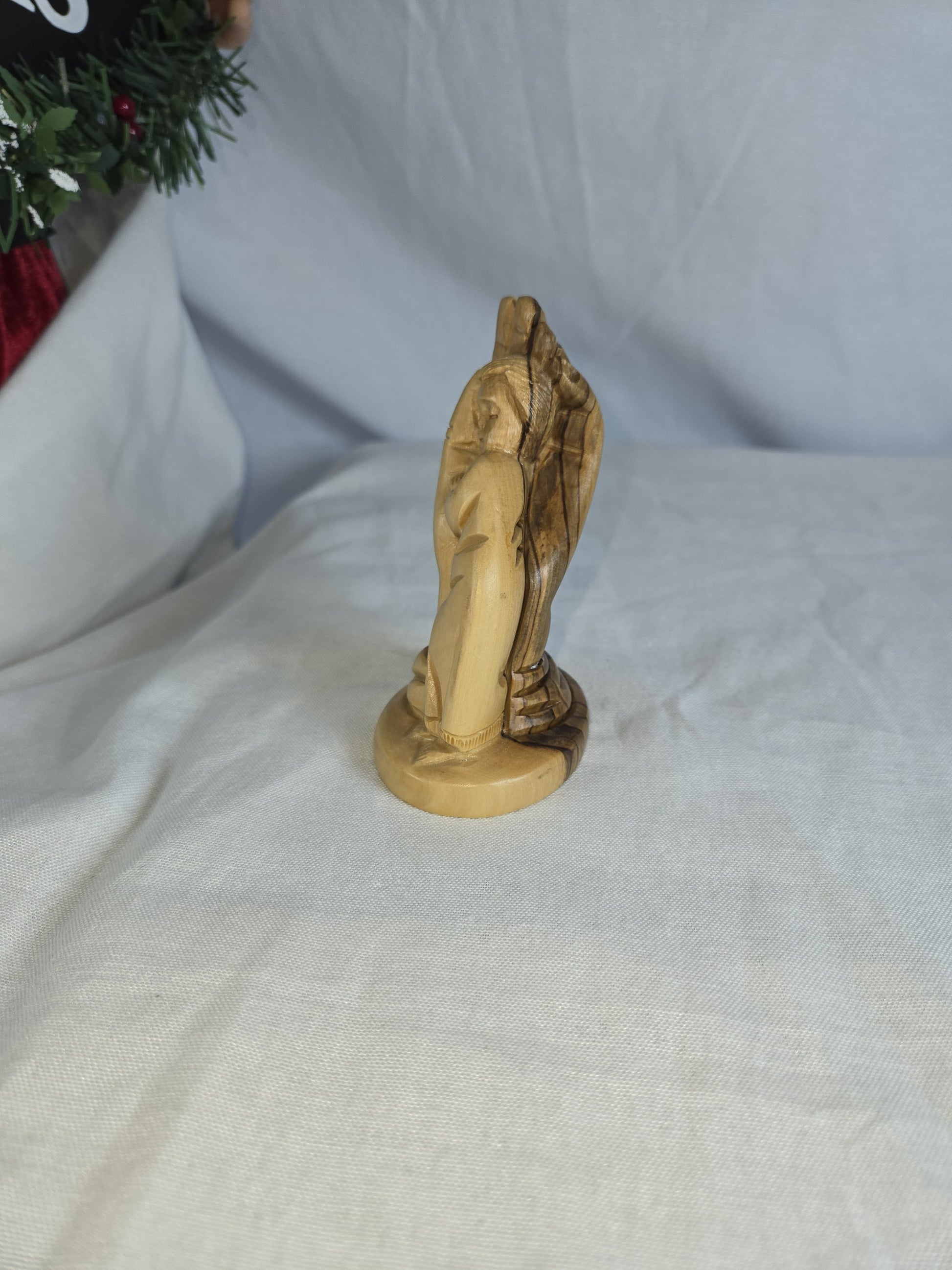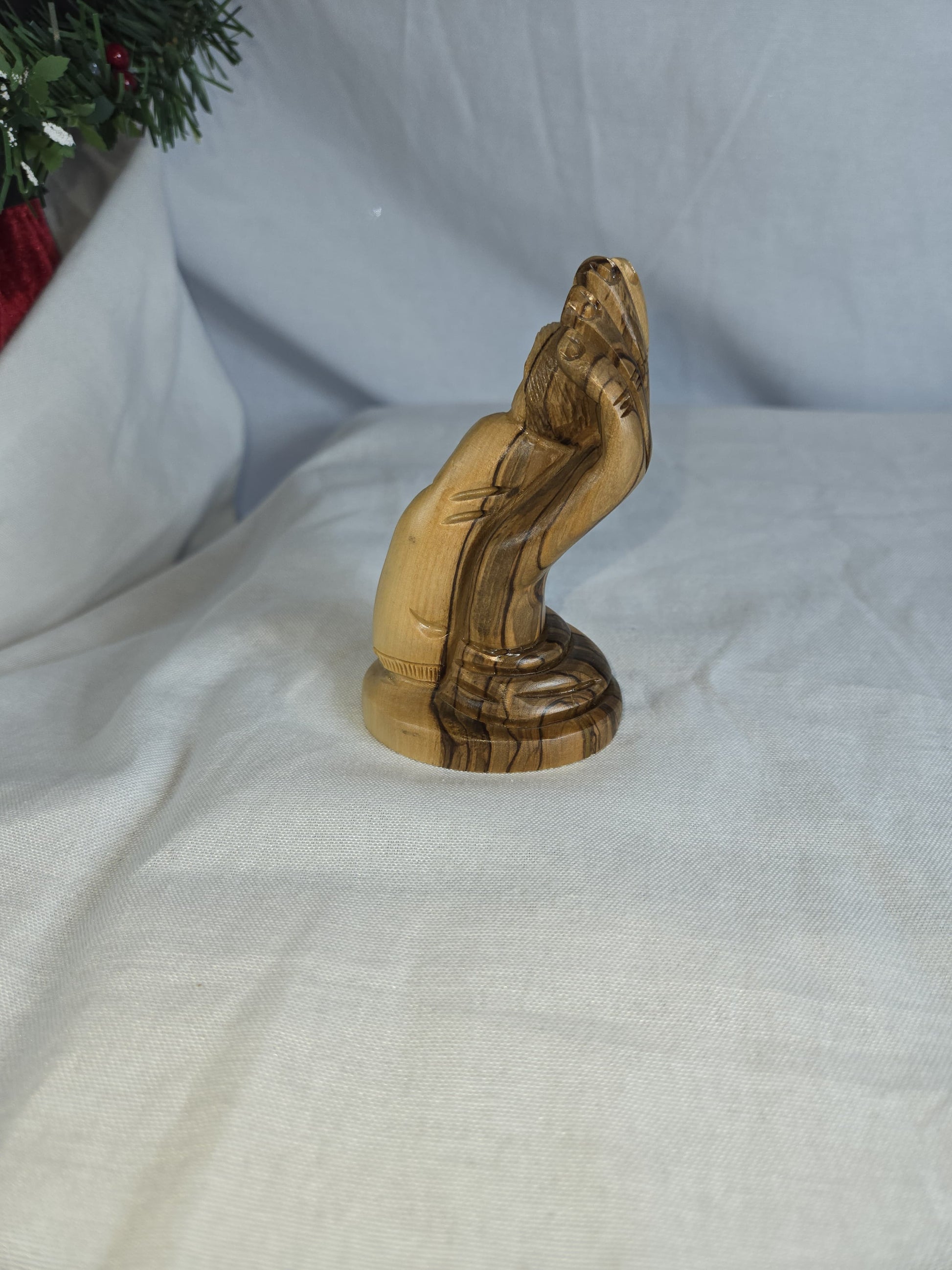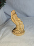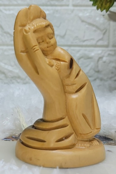 Olive wood sculpture depicting a child nestled within a hand, titled "Child in the Hand of God" or similar, symbolizing divine protection and care. Hand-carved from genuine olive wood sourced from the Holy Land, typically Bethlehem. Represents themes of love, faith, protection, and the divine connection between a child and God. handcrafted by skilled Christian artisans, with each piece being unique due to natural variations in wood grain and color.