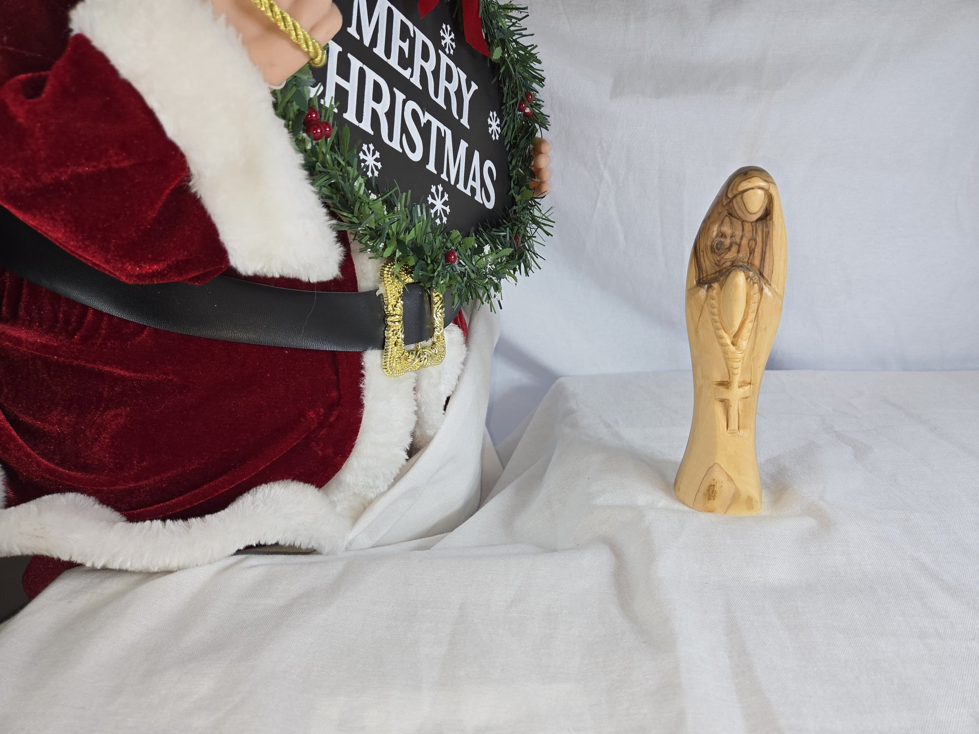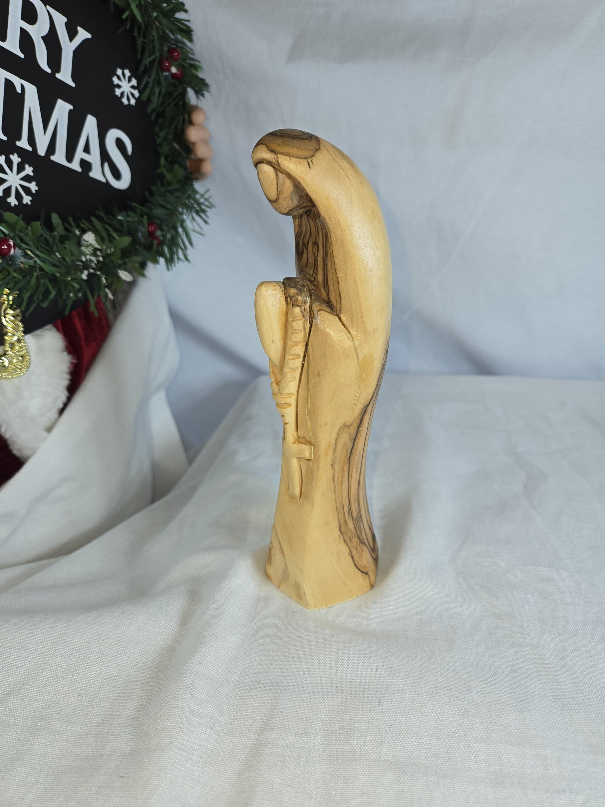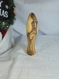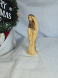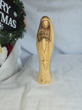 This is a hand-carved olive wood statue of the Virgin Mary, likely crafted in Bethlehem. Made from genuine olive wood, often sourced from the Holy Land. Hand-carved by skilled artisans, showcasing fine details and often depicting the Virgin Mary in prayer or with Baby Jesus. Olive wood is a symbol of peace and spirituality, and the statue represents devotion and faith. handcrafted in Bethlehem, a significant location in Christian history.