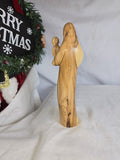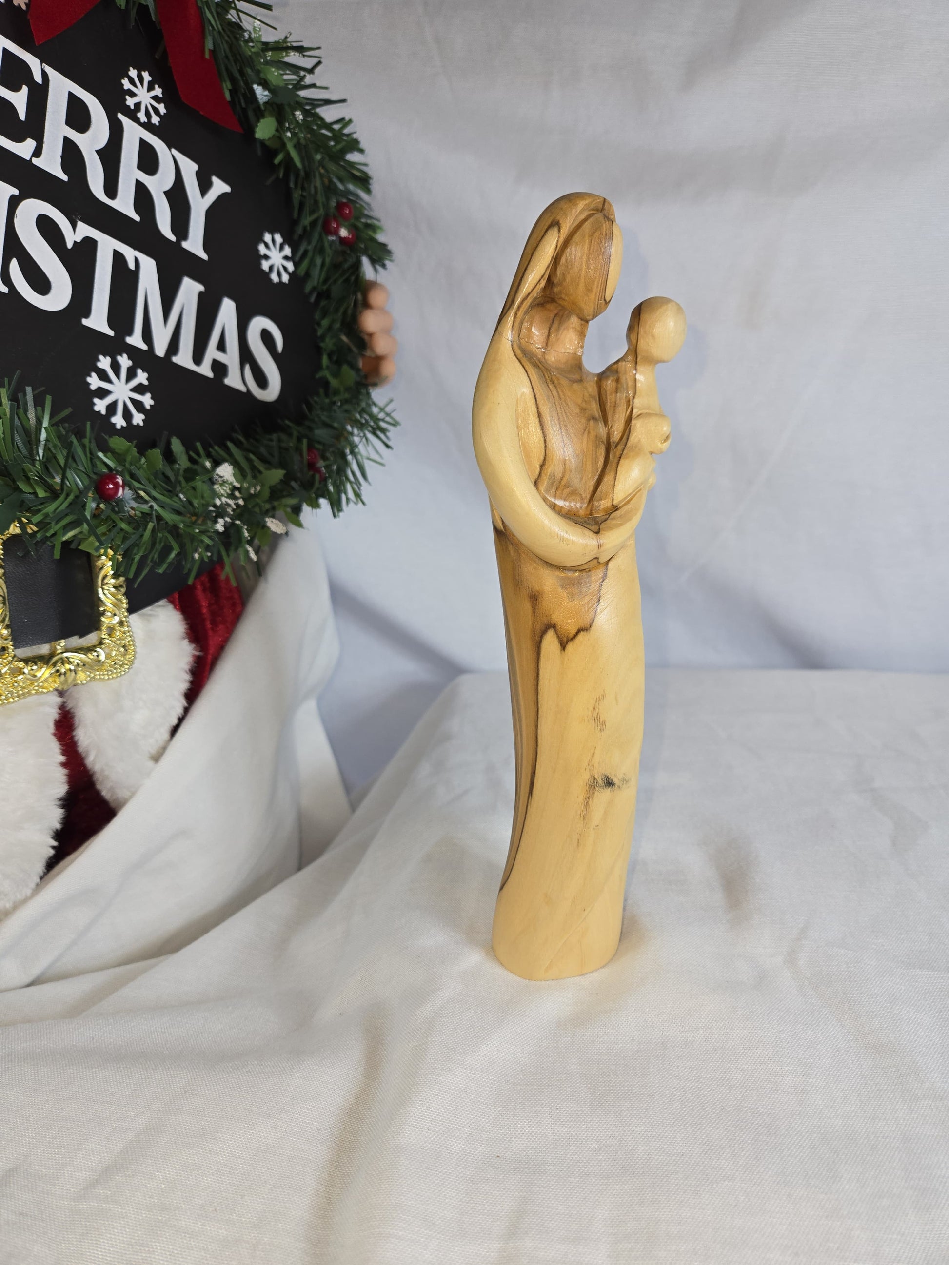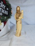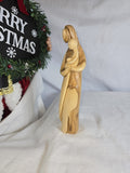 This is a hand-carved olive wood statue depicting the Virgin Mary holding Baby Jesus. Made from authentic Bethlehem olive wood, featuring natural wood grain patterns. Often presented in a modern, abstract, or faceless style, emphasizing the form and the natural beauty of the wood. Represents the love and bond between a mother and child, and holds religious significance for Christians. Hand-carved by Christian artists in the Holy Land, particularly Bethlehem.