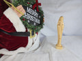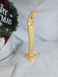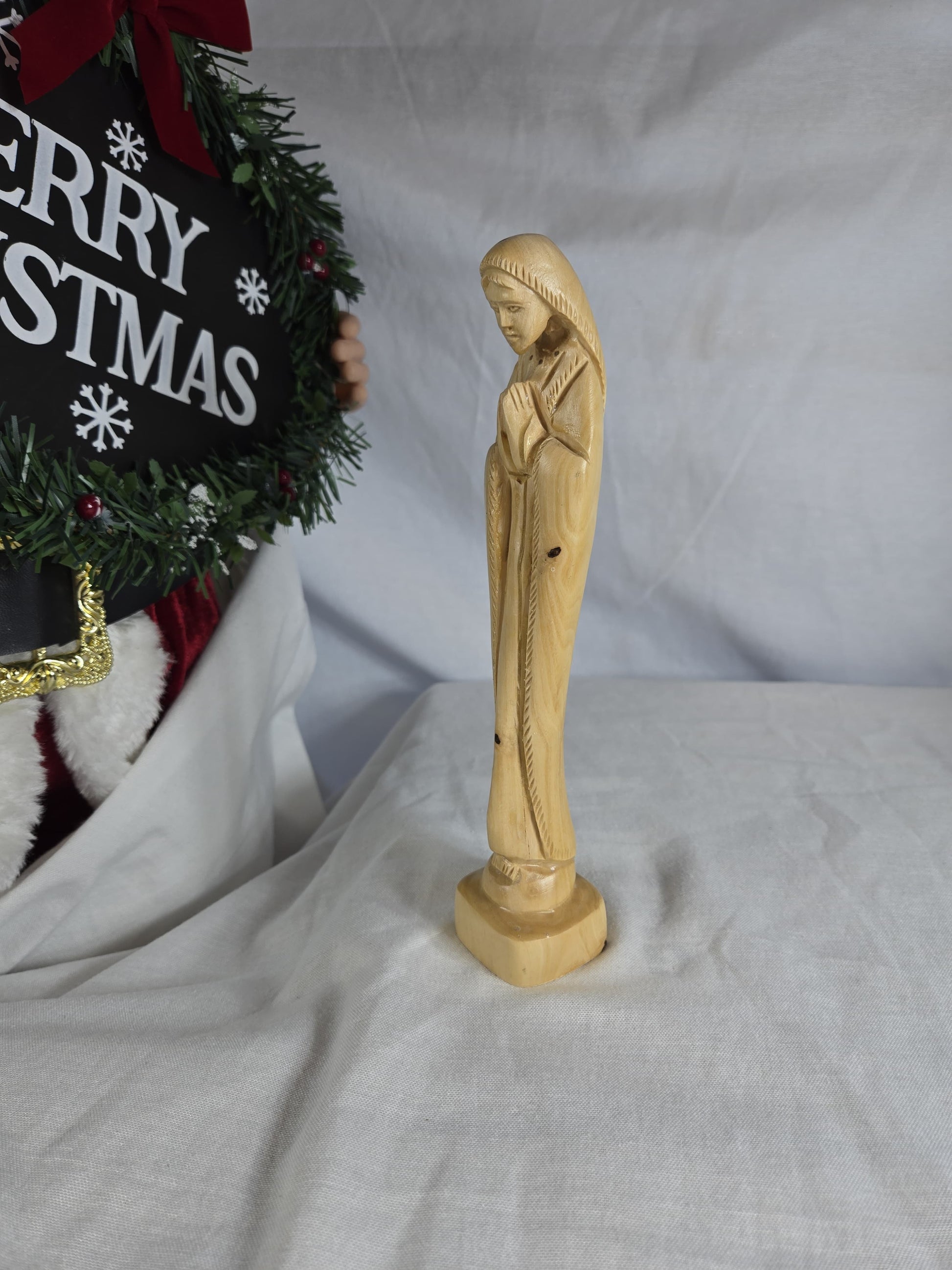 This is a hand-carved statue of the Virgin Mary, likely crafted from olive wood sourced from the Holy Land. It is described as being made from blessed olive wood, a material often associated with spirituality and peace. The olive wood rom the Holy Land. Each statue is described as a unique, hand-carved creation.