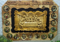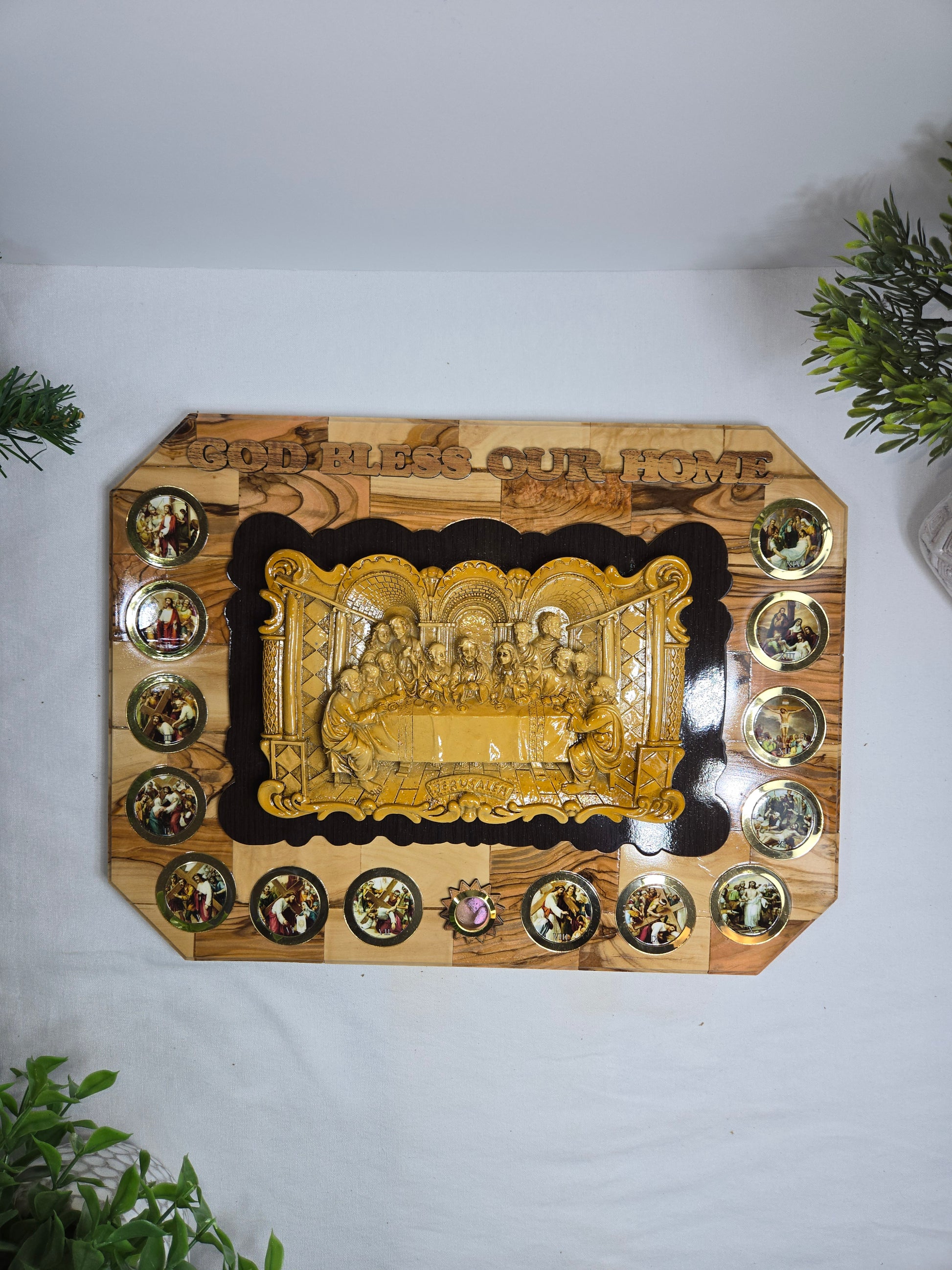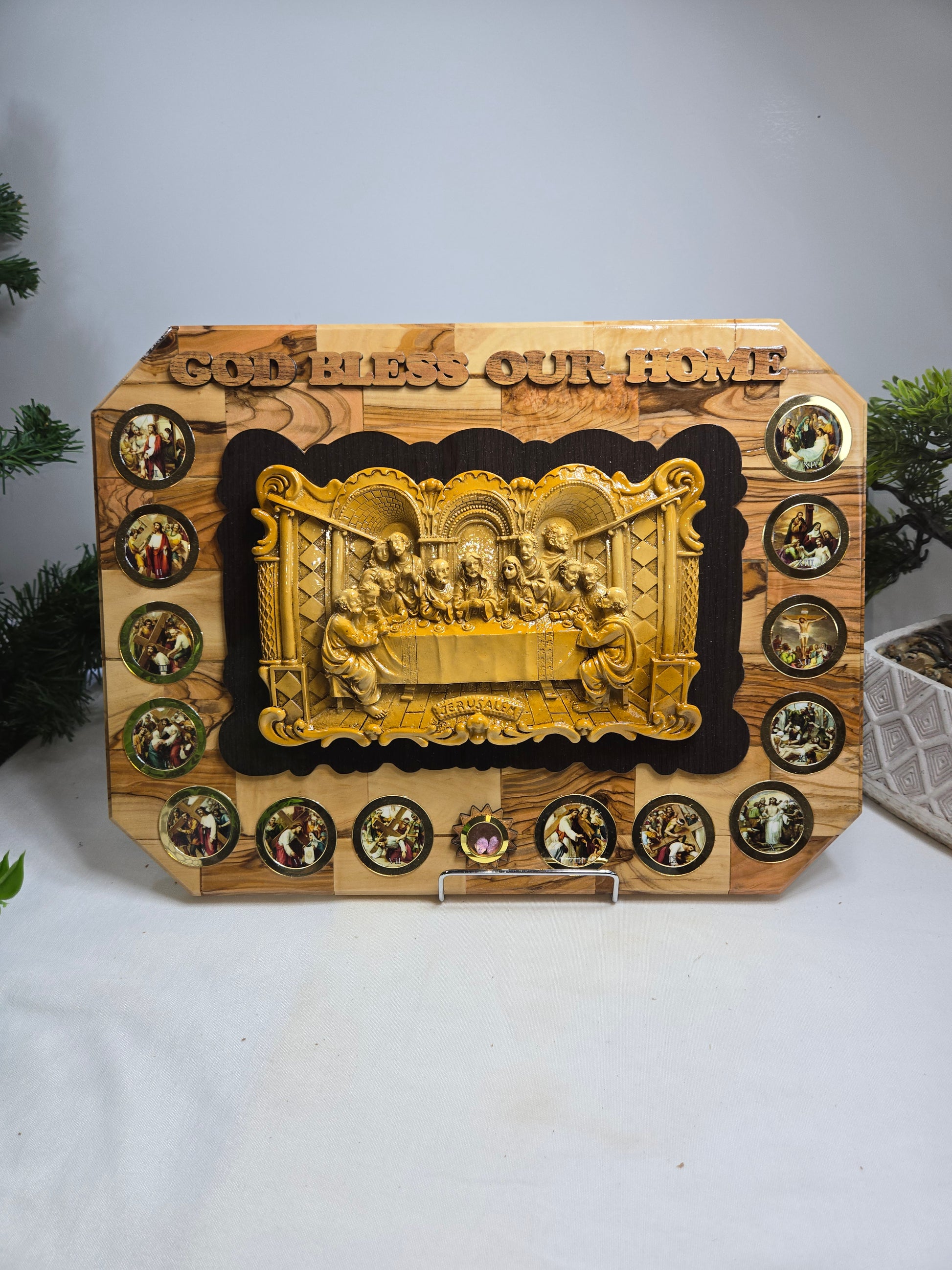 This wall plaque featuring a depiction of the Last Supper and the phrase "GOD BLESS OUR HOME". It is a handcrafted piece, often made with olive wood from the Holy Land, and may include elements like silver-plated figures. The plaque typically features the Last Supper scene in the center, surrounded by smaller circular images of the 14 stations, and the "God Bless Our Home" inscription at the top. Size: 16x12x2in