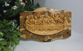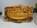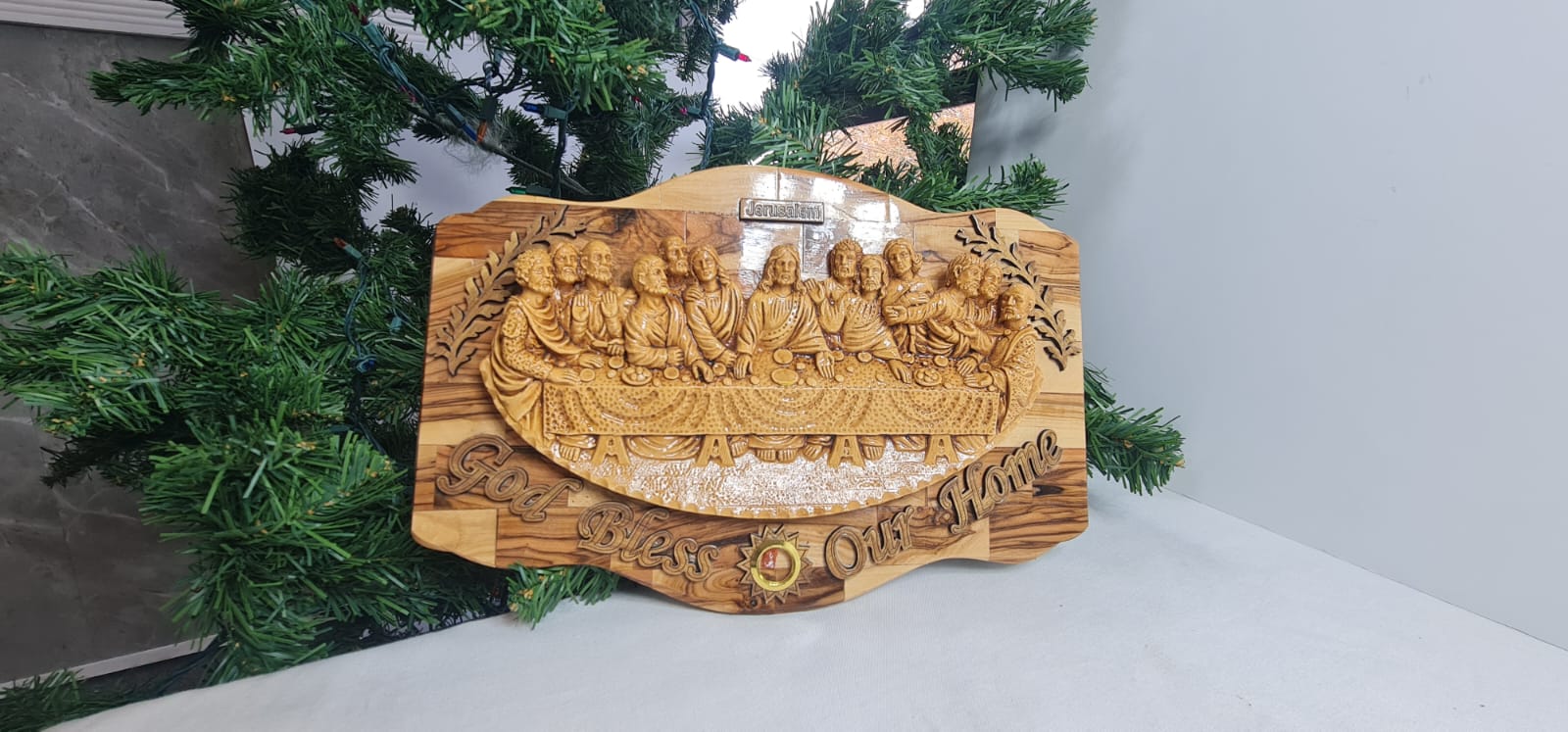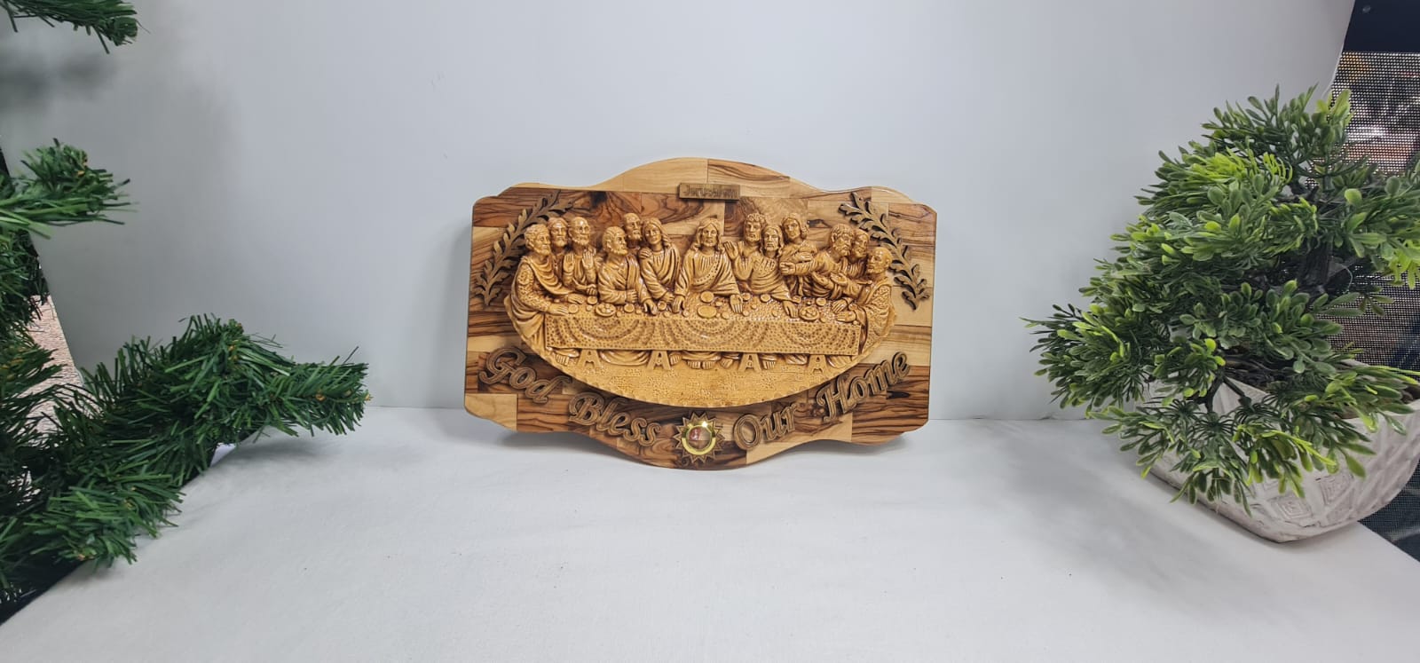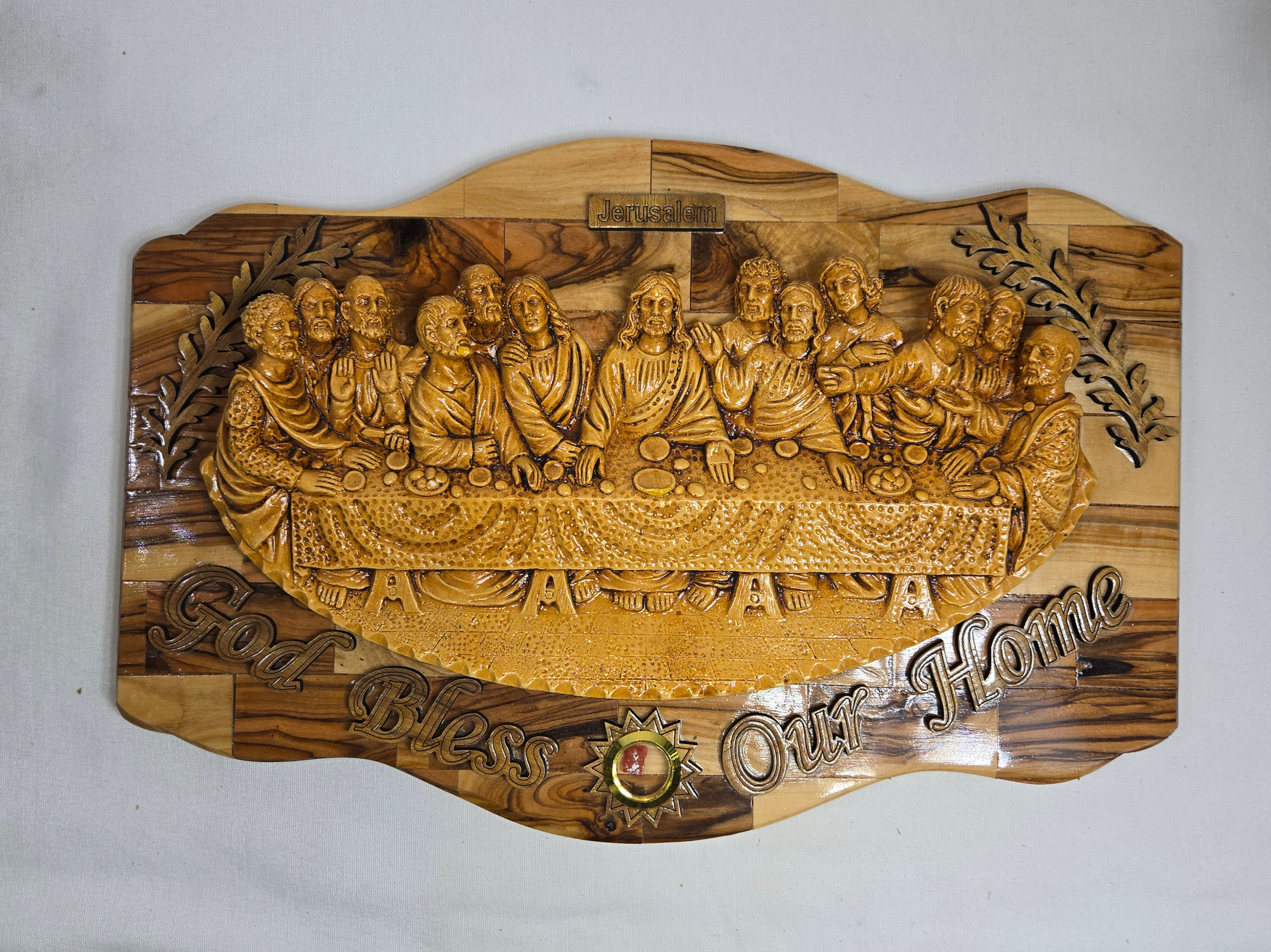 The plaque is made from genuine olive wood, often sourced from the Bethlehem area in the Holy Land. It features an intricate, three-dimensional carving of Jesus and his twelve disciples. The wood is known for its hardness, unique grain patterns, and smooth feel. The text "God Bless Our Home" is visible at the bottom of the plaque