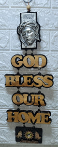 This olive wood hanging decoration with the phrase "GOD BLESS OUR HOME" and an image of Jesus. Product: Olivewood "God Bless Our Home" Jesus Hanging Decoration. Material: Made from olive wood, sourced from Bethlehem as indicated by the text partially visible in the image. Design: Features a carved image of Jesus above the phrase "GOD BLESS OUR HOME." Purpose: Designed for hanging as a decorative piece in a home, conveying a blessing. Size: 14x4x1