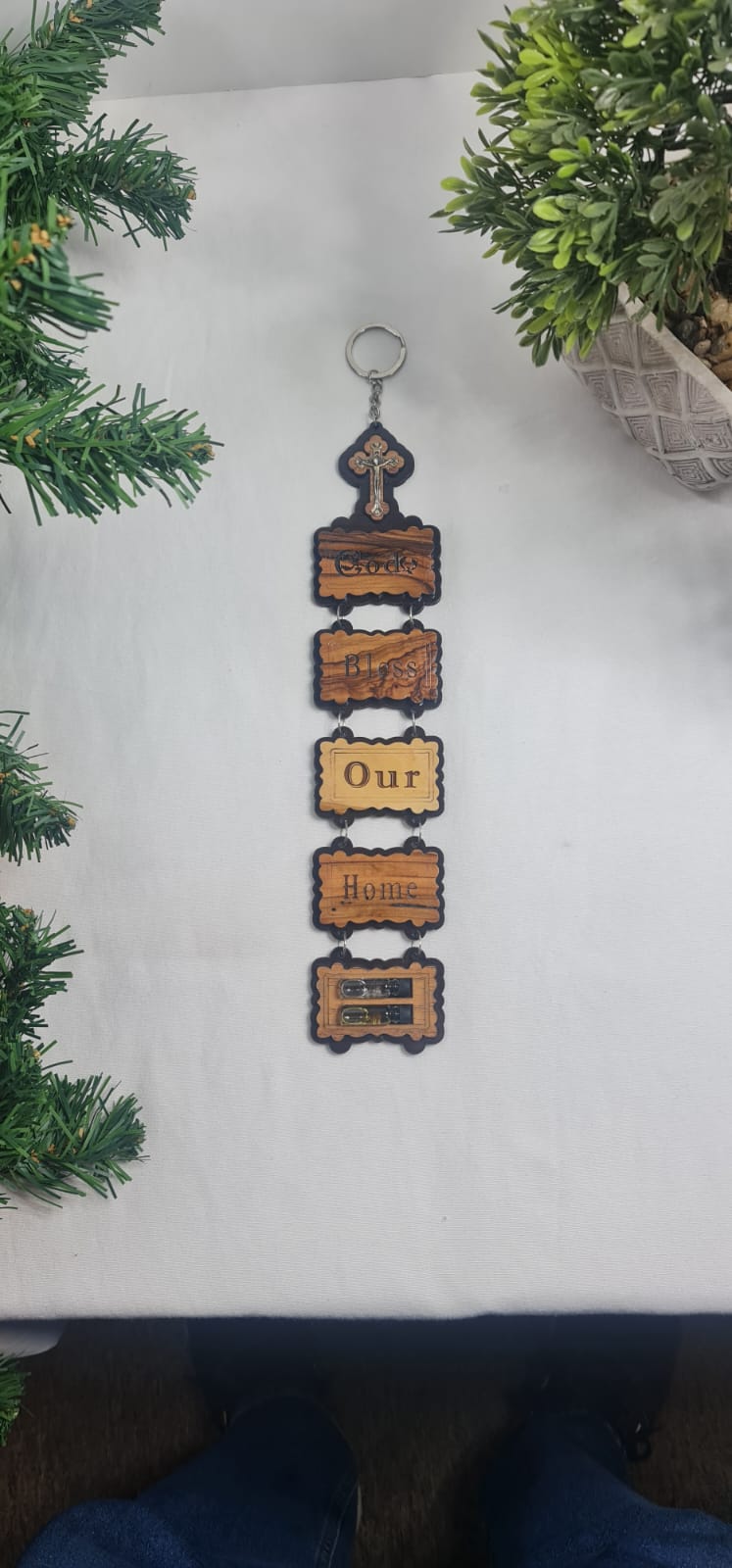 "God Bless Our Home" wall sign.Description: It's a decorative piece typically featuring the phrase "God Bless Our Home" and often includes a religious symbol, such as a cross, as seen in the image. Material and Craftsmanship: These signs are frequently crafted from wood, often olive wood, and can be hand-carved .Purpose: They serve as Christian home decor, intended to bring a sense of faith, blessing, and warmth to a living space. Size: 14x4x1