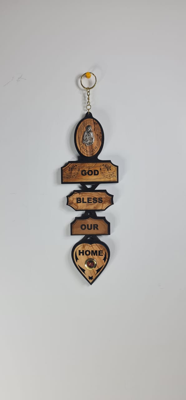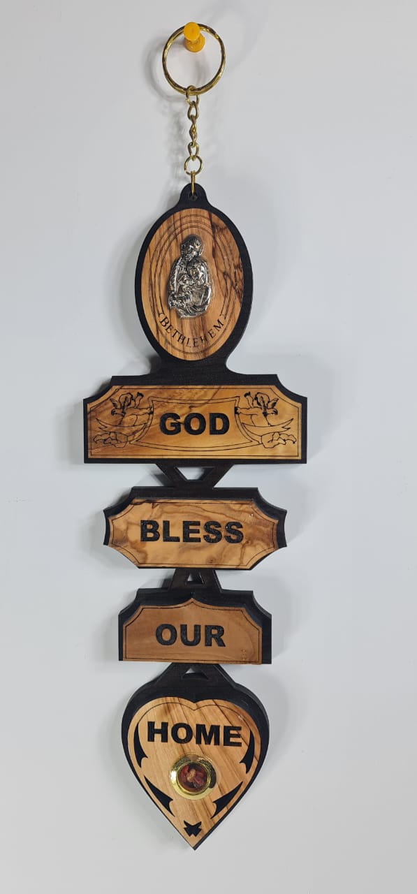This is a "God Bless Our Home" wall plaque, hand crafted from genuine olive wood sourced from the Holy Land. It features an engraved message "God Bless Our Home" across several linked wooden segments. The top segment typically includes an image, such as the Holy Family. it includes a container with holy incense from the Holy Land. It is a popular religious home décor item and a common gift for occasions like housewarmings.