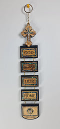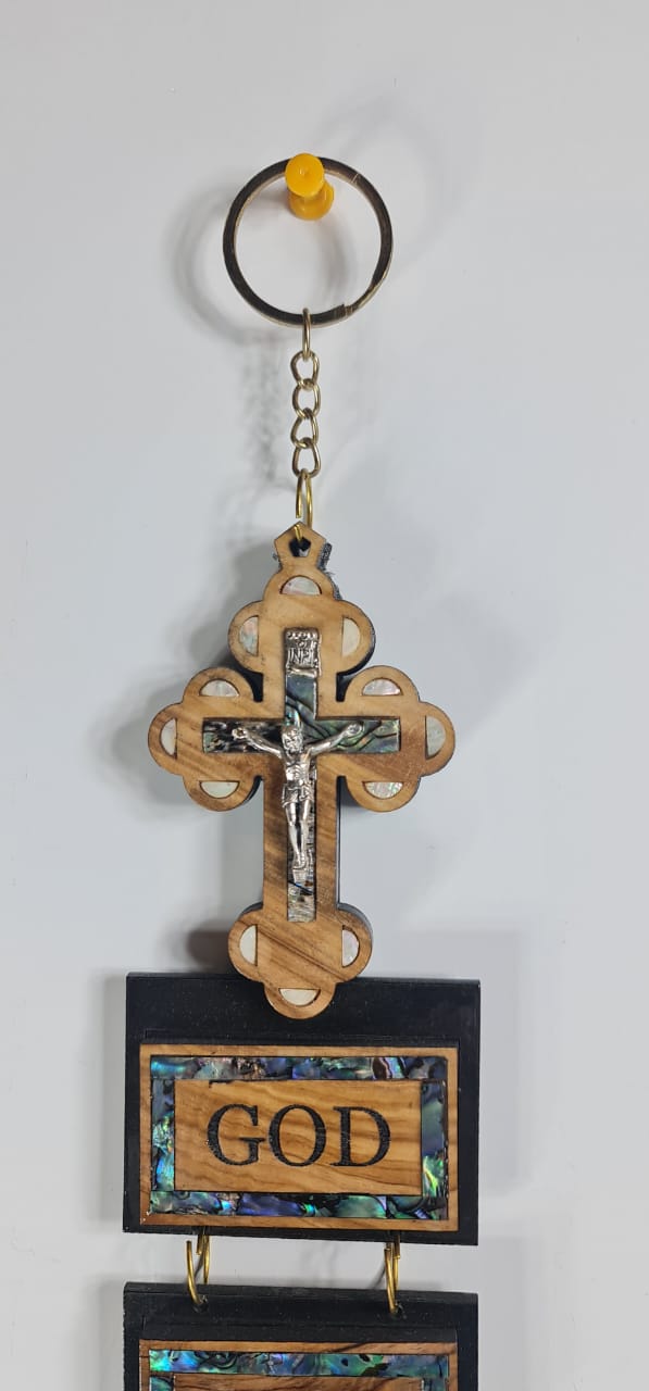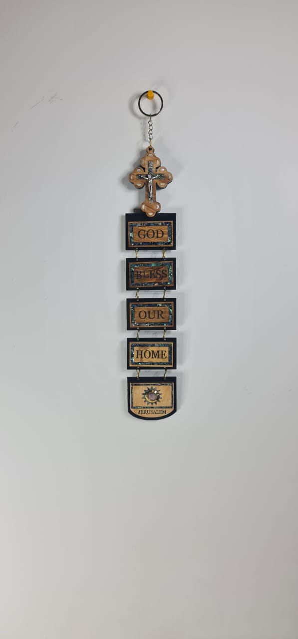 The religious wall hanging featuring a cross and the phrase "GOD BLESS OUR HOME" spelled out on individual plaques beneath it. This type of item is a popular piece of Christian home décor, often made from materials like olive wood or mahogany. Description: It typically features a cross at the top, followed by a series of connected panels or blocks spelling out "GOD BLESS OUR HOME" Purpose: These wall hangings serve as a religious blessing for the home, symbolizing faith and inviting divine protection and peace. Materials: Common materials include handcrafted olive wood, from Bethlehem. Size: 14x4x1