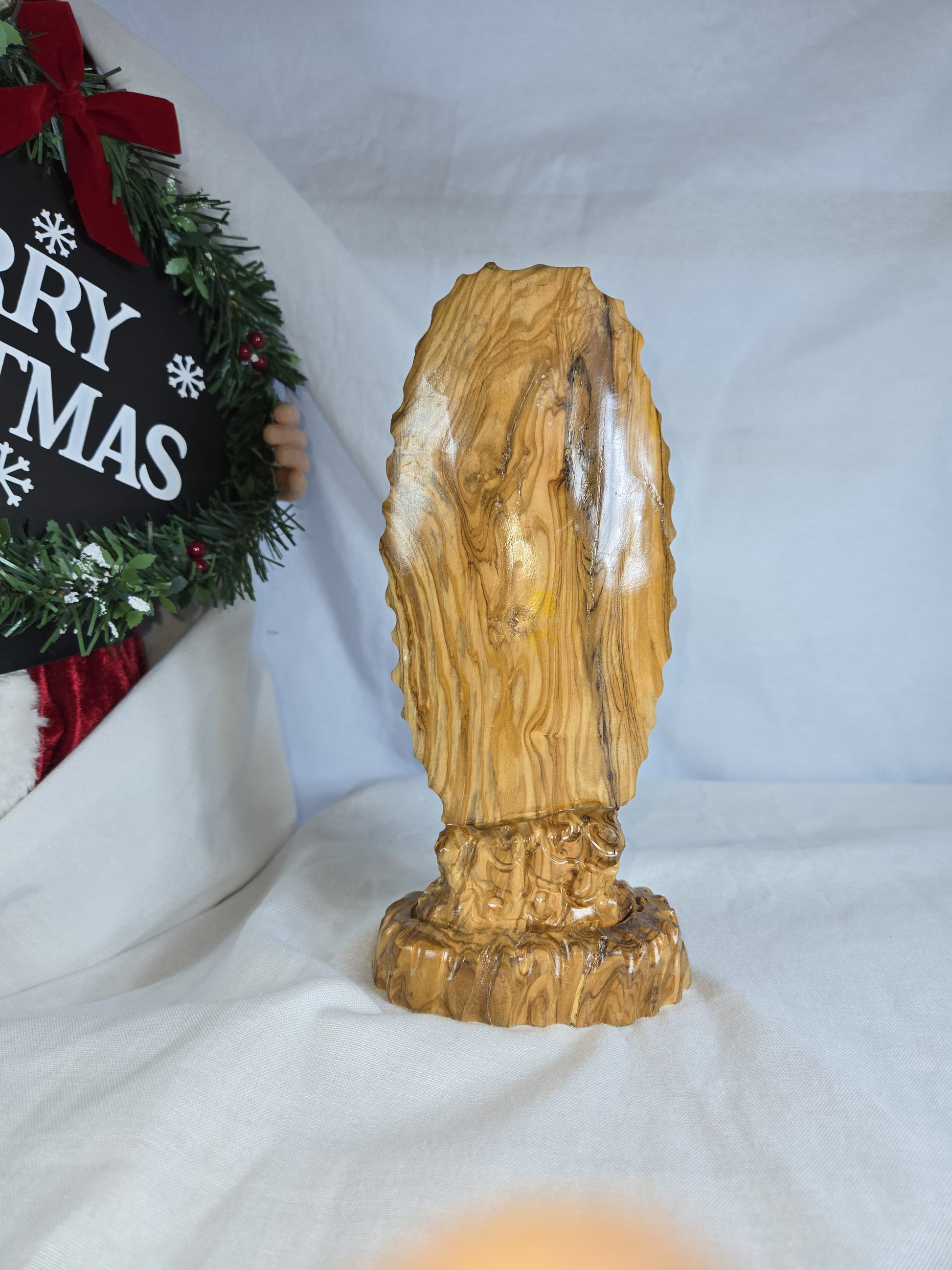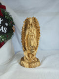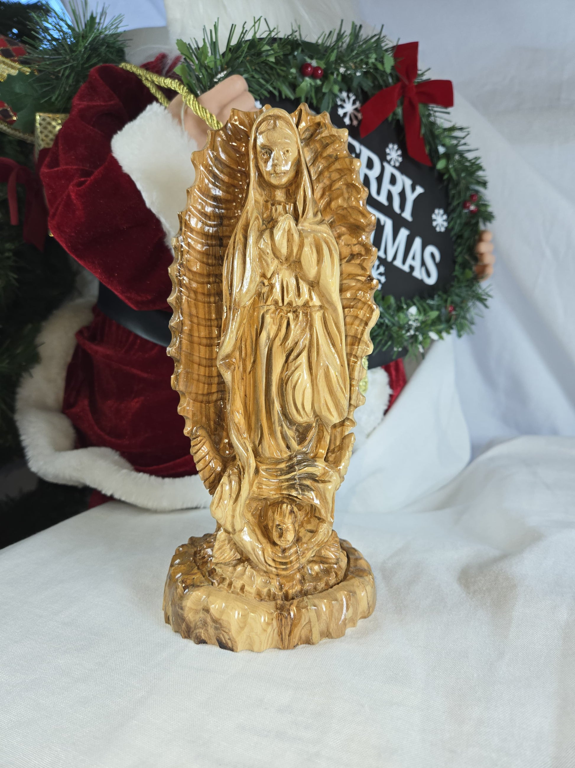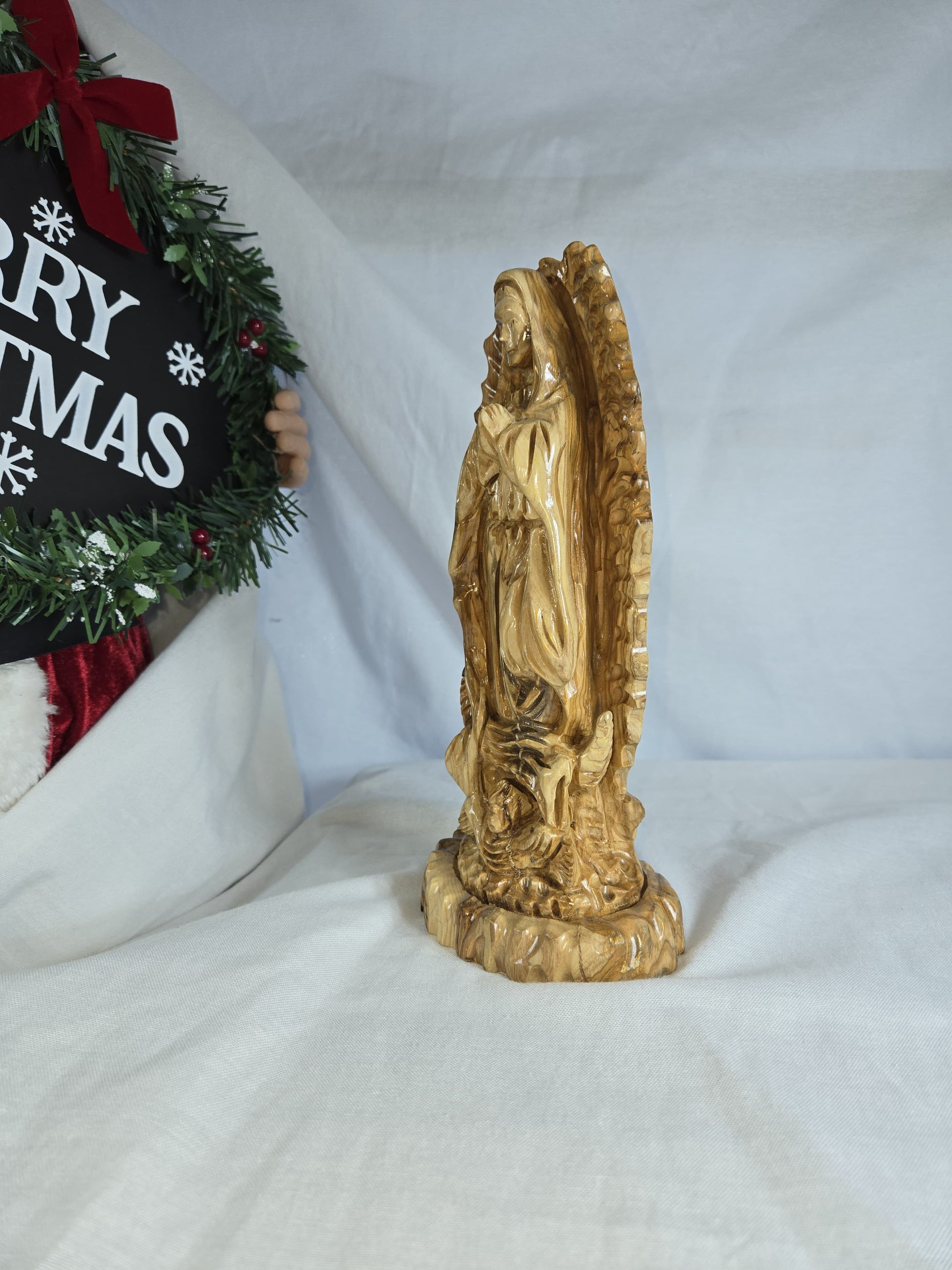 This is a hand-carved olive wood statue of Our Lady of Guadalupe. Crafted from genuine olive wood, sourced from the Holy Land. Hand-carved by master artisans, often in Bethlehem, featuring intricate details like facial features and the Virgin Mary's serene expression. Represents Our Lady of Guadalupe, also known as the Virgin of Guadalupe, a Roman Catholic title of the Blessed Virgin Mary. Serves as a religious artifact and a focal point for prayer, contemplation, and spiritual connection.