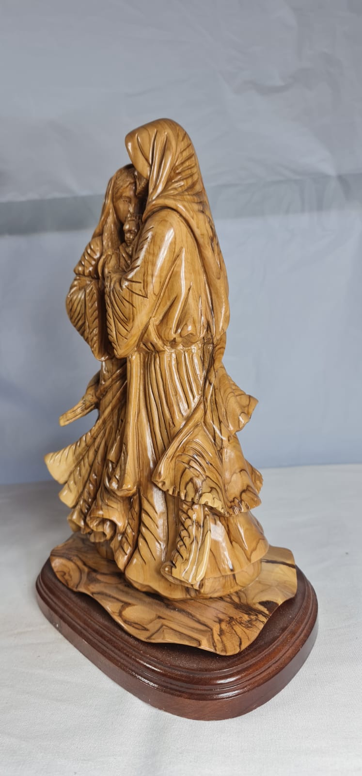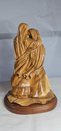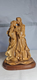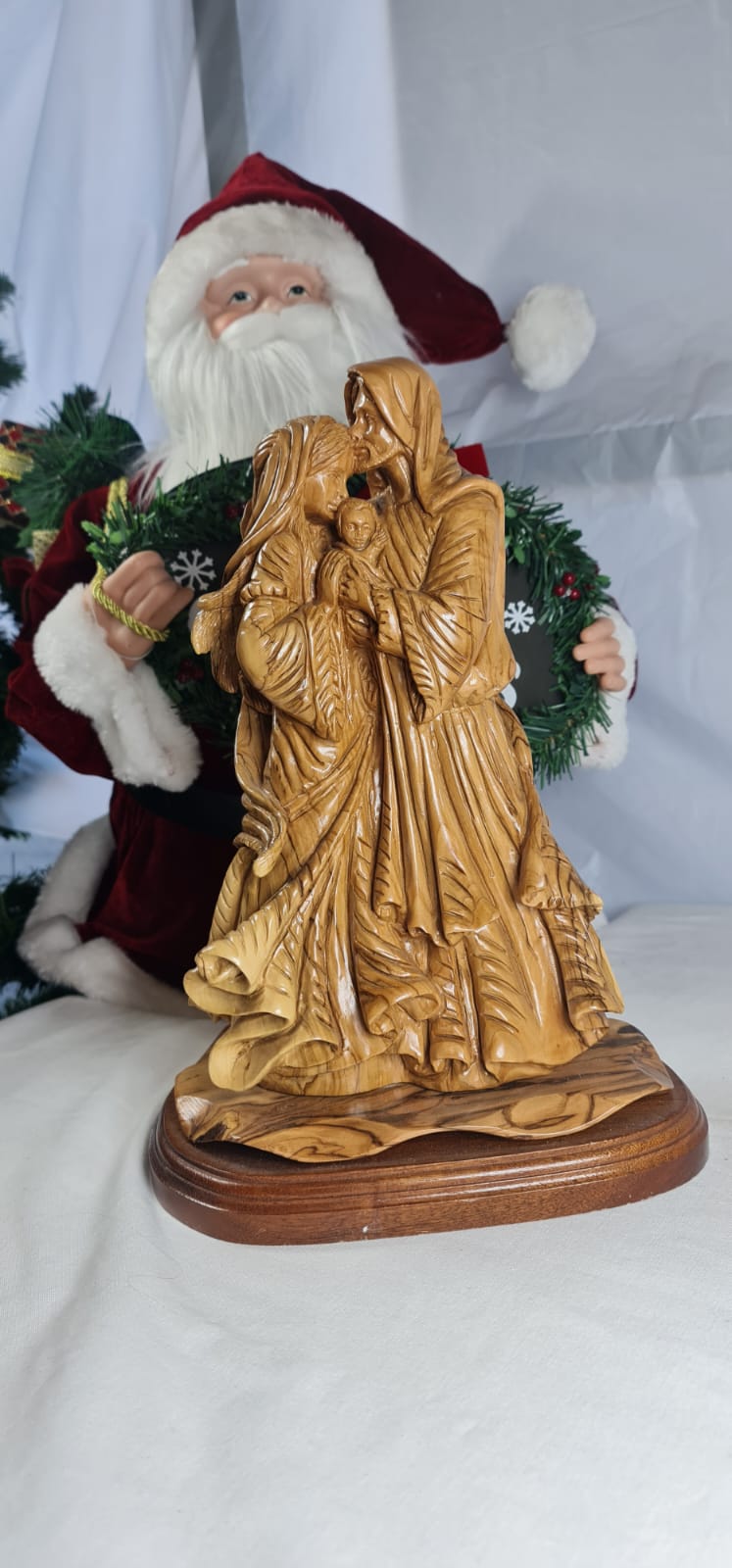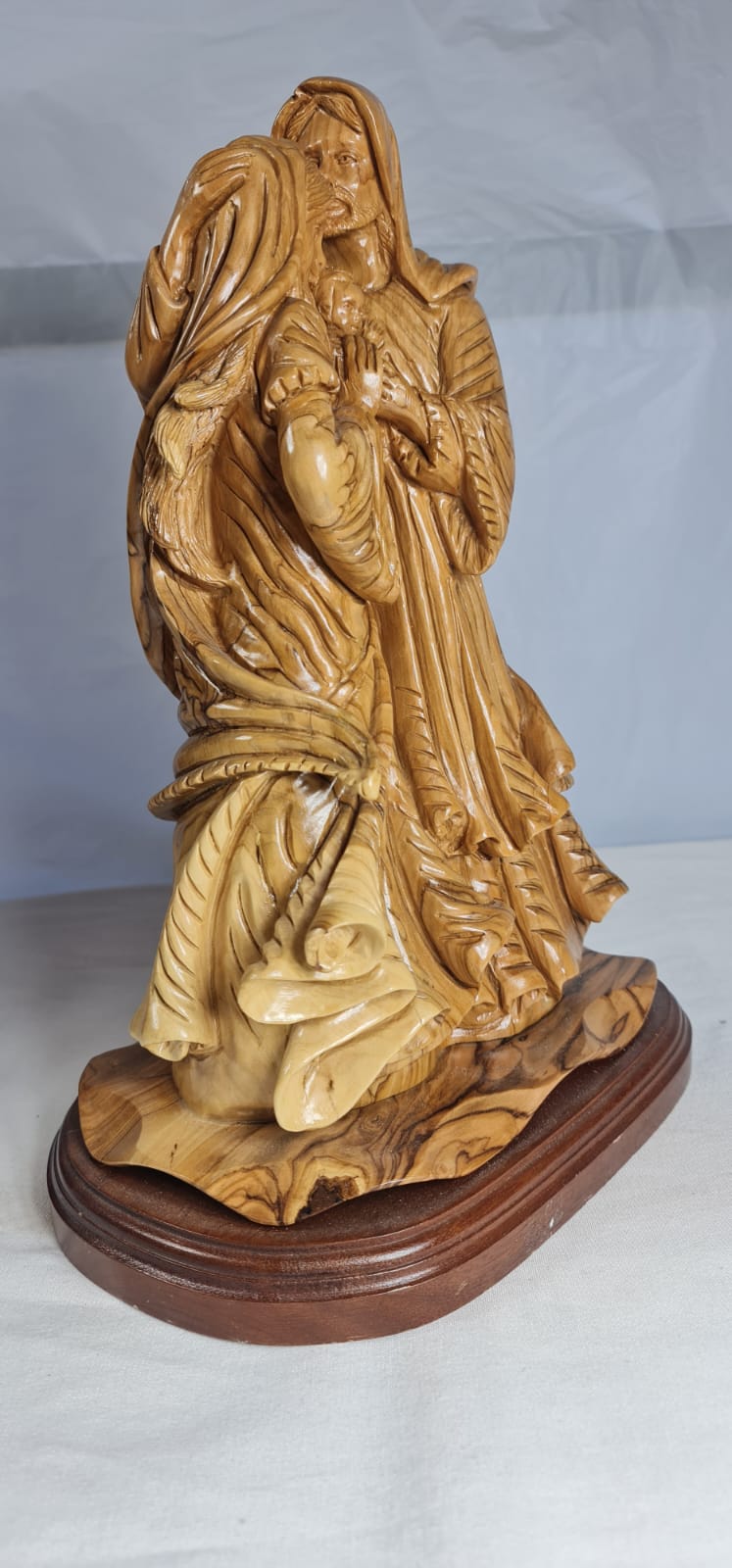 This olive wood sculpture depicting the Holy Family (Jesus, Mary, and Joseph). it emphasizes the intimacy and love within the Holy Family. It is handcrafted from Bethlehem olive wood, often by artisans in the Holy Land. Such sculptures are considered symbols of faith, love, and devotion within Christian tradition.