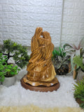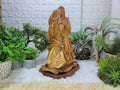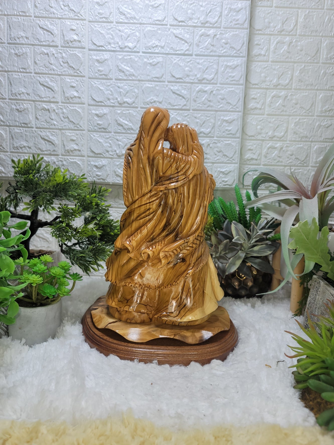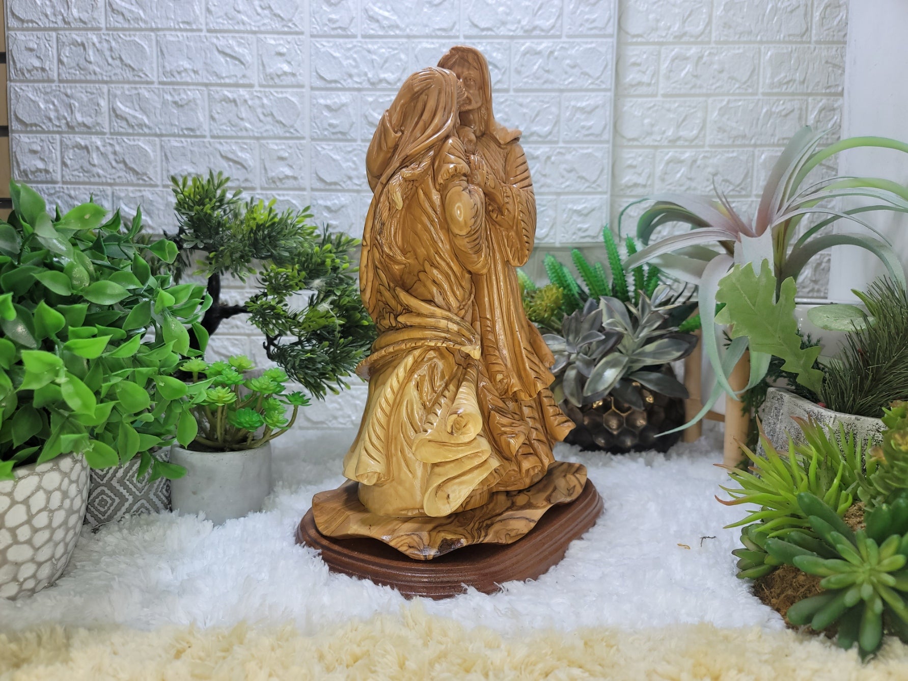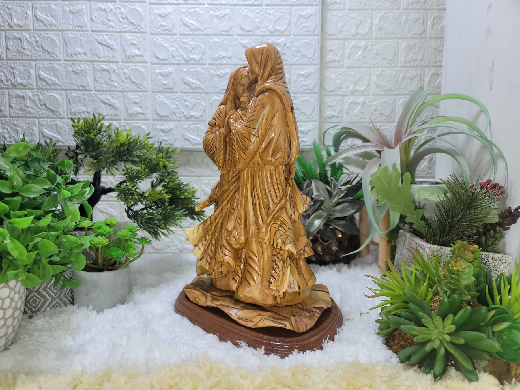 This olive wood sculpture depicting the Holy Family (Jesus, Mary, and Joseph). it emphasizes the intimacy and love within the Holy Family. It is handcrafted from Bethlehem olive wood, often by artisans in the Holy Land. Such sculptures are considered symbols of faith, love, and devotion within Christian tradition