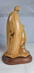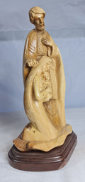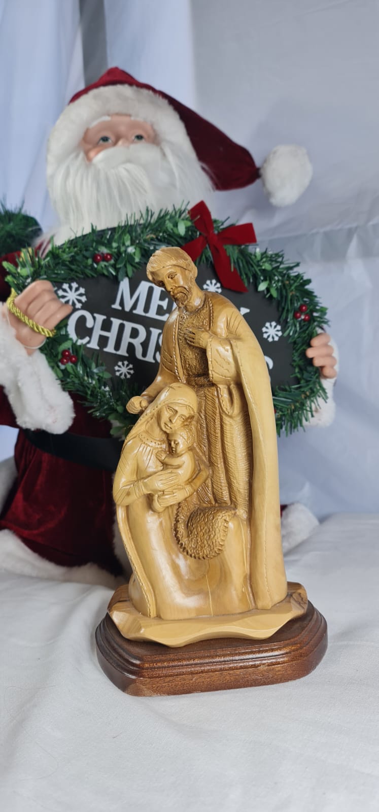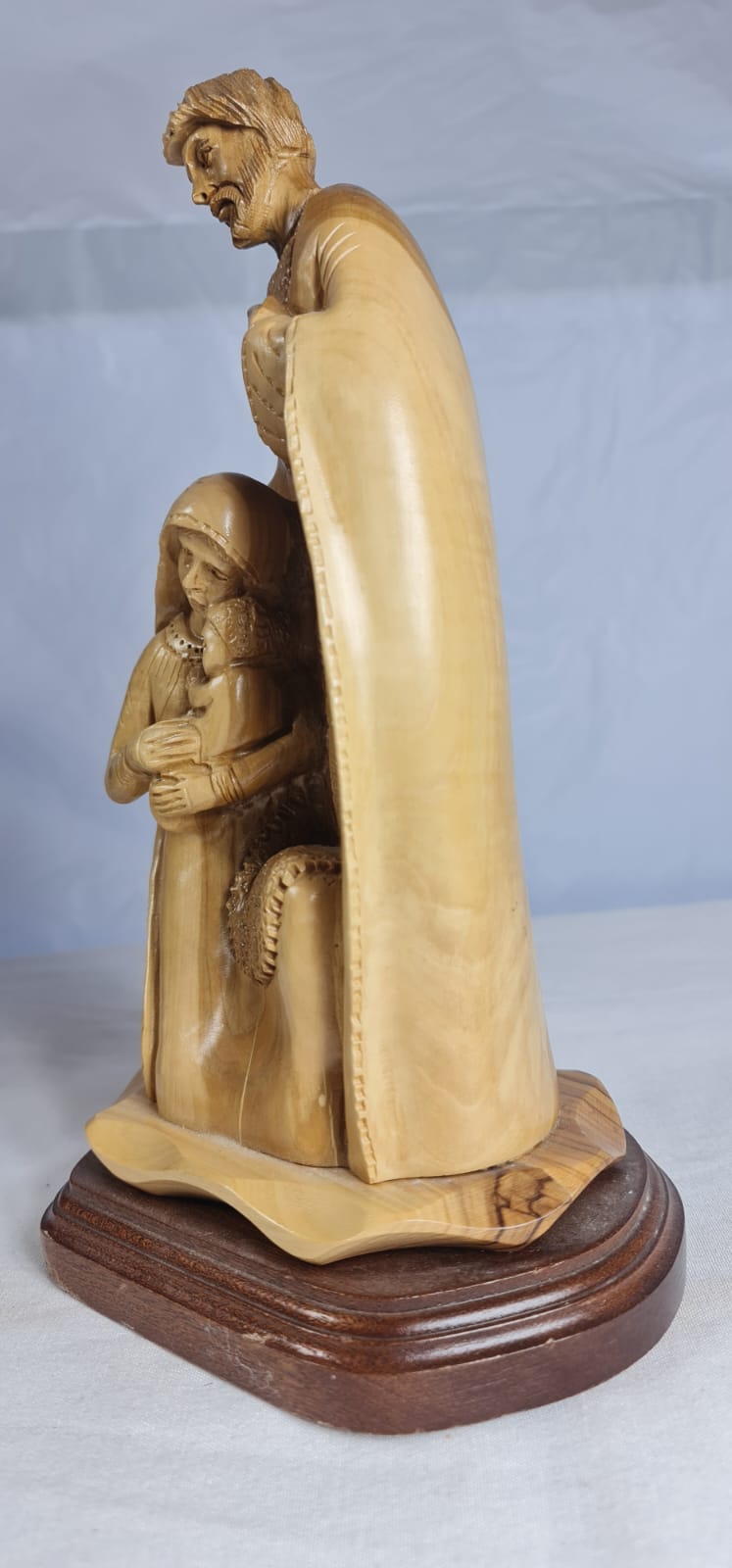 Hand-carved olive wood sculpture of the Holy Family, depicting Joseph, Mary, and baby Jesus. Crafted from olive wood, sourced from Bethlehem. Represents the Holy Family, a significant religious symbol in Christianity. Often created by artisans in the Holy Land, particularly Bethlehem.