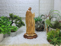 olive wood statue of the Holy Family, featuring Saint Joseph, Mary, and the infant Jesus. The statue is hand-carved from olive wood, a material often associated with the Holy Land and rich in biblical symbolism.Saint Joseph is depicted holding a lantern, symbolizing his role in guiding and protecting the Holy Family. The statue captures a serene atmosphere, representing the birth of Jesus and the love within the Holy Family. This type of artwork is created by artisans in Bethlehem and serves as a reminder of the spiritual significance of the Holy Land
