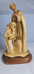 olive wood statue of the Holy Family, featuring Saint Joseph, Mary, and the infant Jesus. The statue is hand-carved from olive wood, a material often associated with the Holy Land and rich in biblical symbolism.Saint Joseph is depicted holding a lantern, symbolizing his role in guiding and protecting the Holy Family. The statue captures a serene atmosphere, representing the birth of Jesus and the love within the Holy Family. This type of artwork is created by artisans in Bethlehem and serves as a reminder of the spiritual significance of the Holy Land.