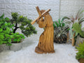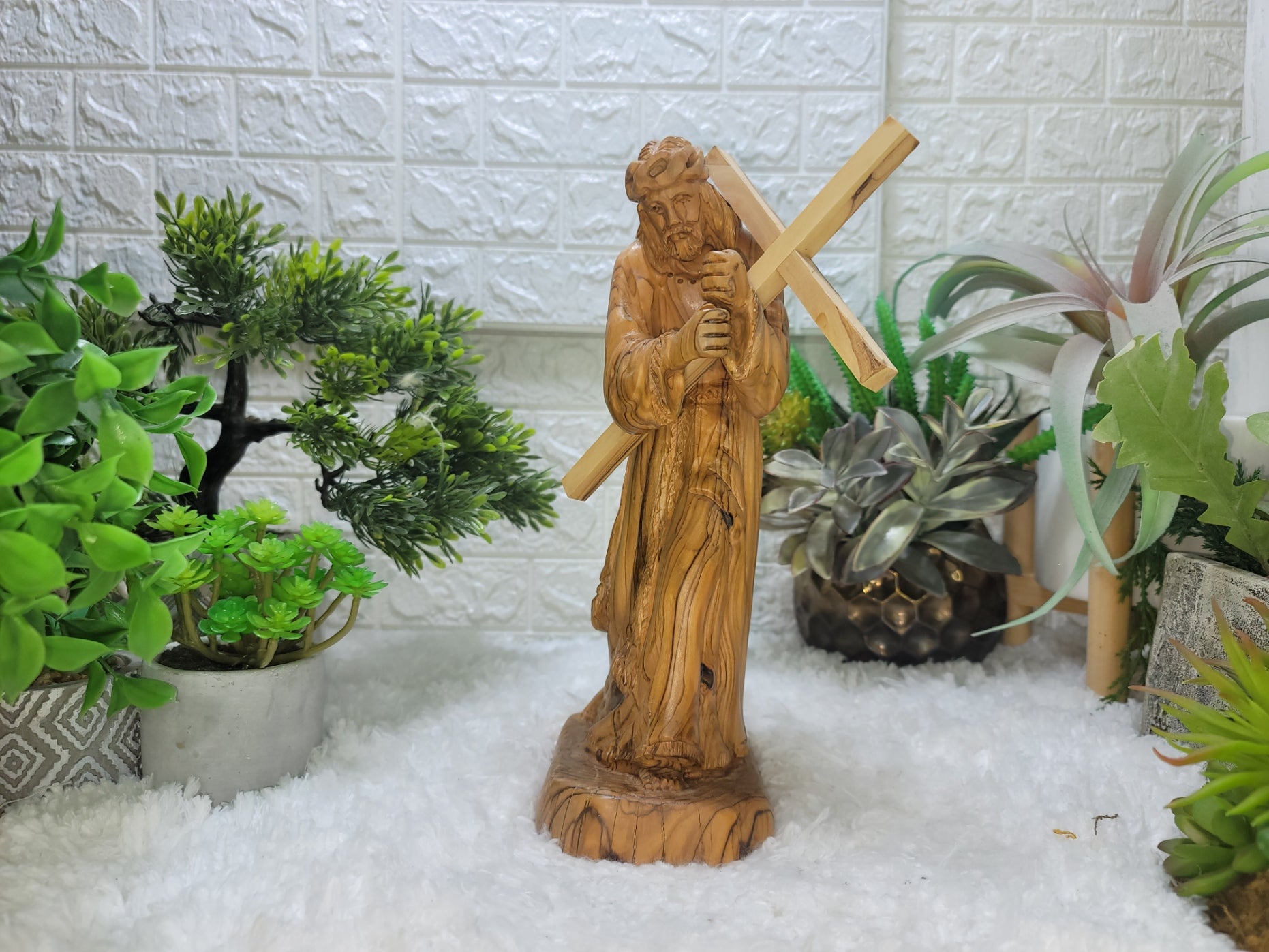 This is a statue depicting Jesus carrying the cross to Calvary. It is hand-carved from olive wood, a common material for such religious statues from the Holy Land.It's handcrafted in the Holy Land, particularly in Bethlehem and Jerusalem. It represents a significant moment in Christian tradition, symbolizing Jesus' sacrifice and love for humanity.