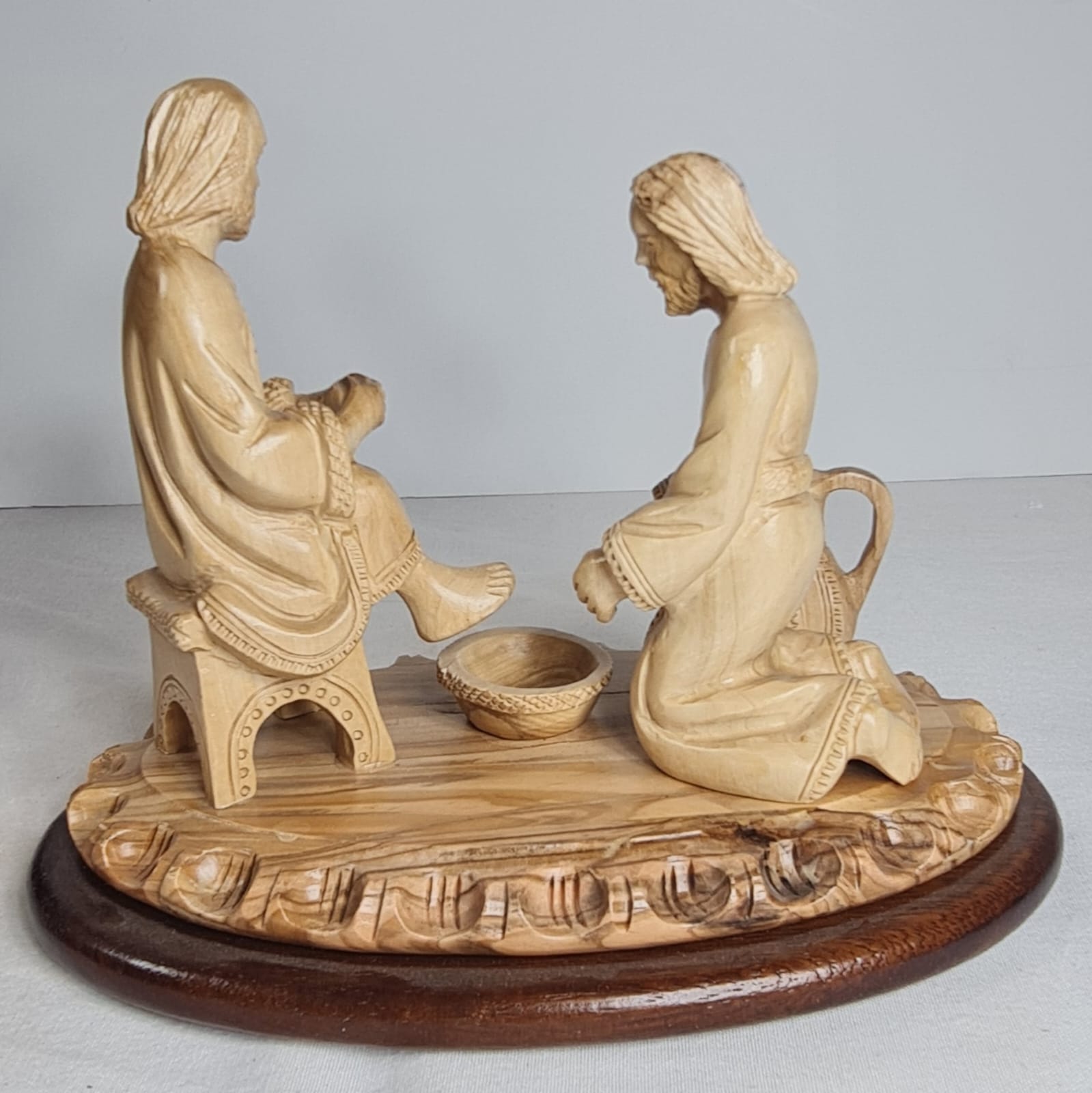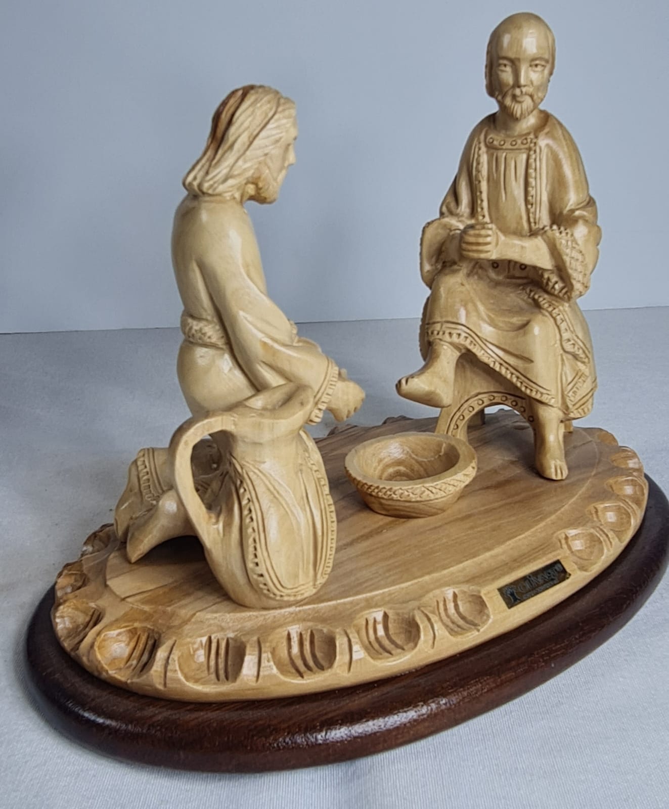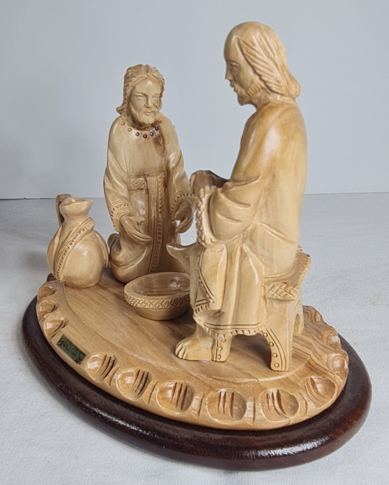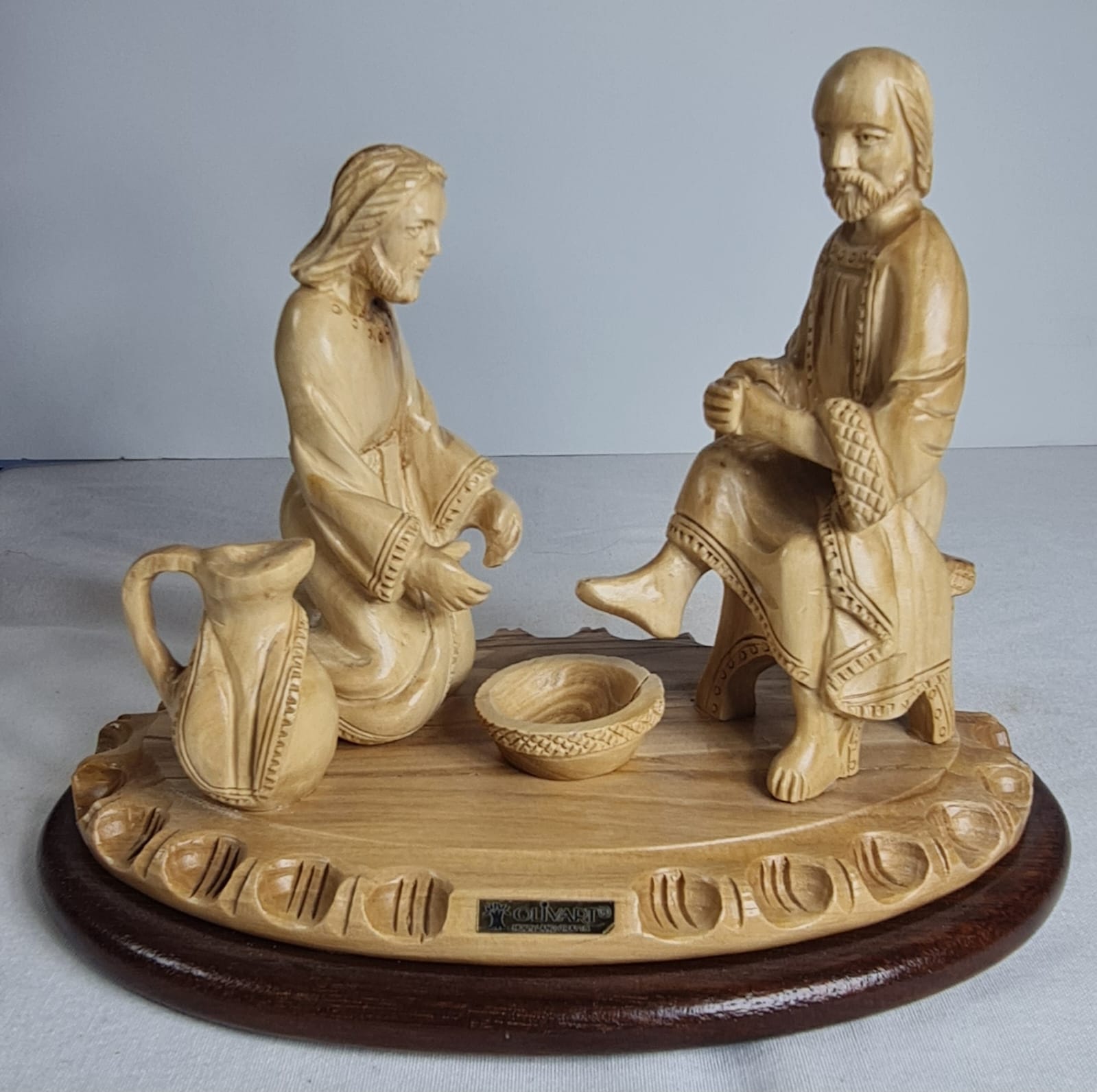 The hand-carved olive wood statue depicting Jesus washing the feet of one of his disciples, an event described in the Gospel of John (Chapter 13). This iconic scene, often referred to as the Washing of the Feet, is a powerful symbol of humility, service, and love within Christianity. The statue captures the moment during the Last Supper when Jesus, knowing his impending crucifixion, humbled himself by performing the task typically reserved for the lowest servant – washing the feet of his disciples, including Peter and even Judas Iscariot. This act serves as a profound example of servant leadership and humility, teaching his followers to serve one another with love and to put others' needs before their own. It also symbolizes a spiritual cleansing and renewal of commitment to Christ.