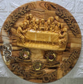 Olive wood wall plaque depicting the Last Supper, a significant event in Christian tradition where Jesus shared his final meal with his disciples. Material: It is handcrafted from authentic olive wood, often sourced from the Holy Land, which gives each piece unique grain patterns. Depiction: The central carving features Jesus and the twelve disciples at the Last Supper, sometimes with detailed porcelain figures set within the olive wood. Origin: made by artisans in Bethlehem or other parts of the Holy Land. Size: 10x10x2