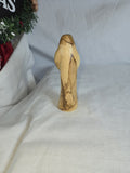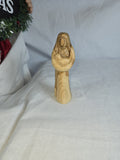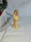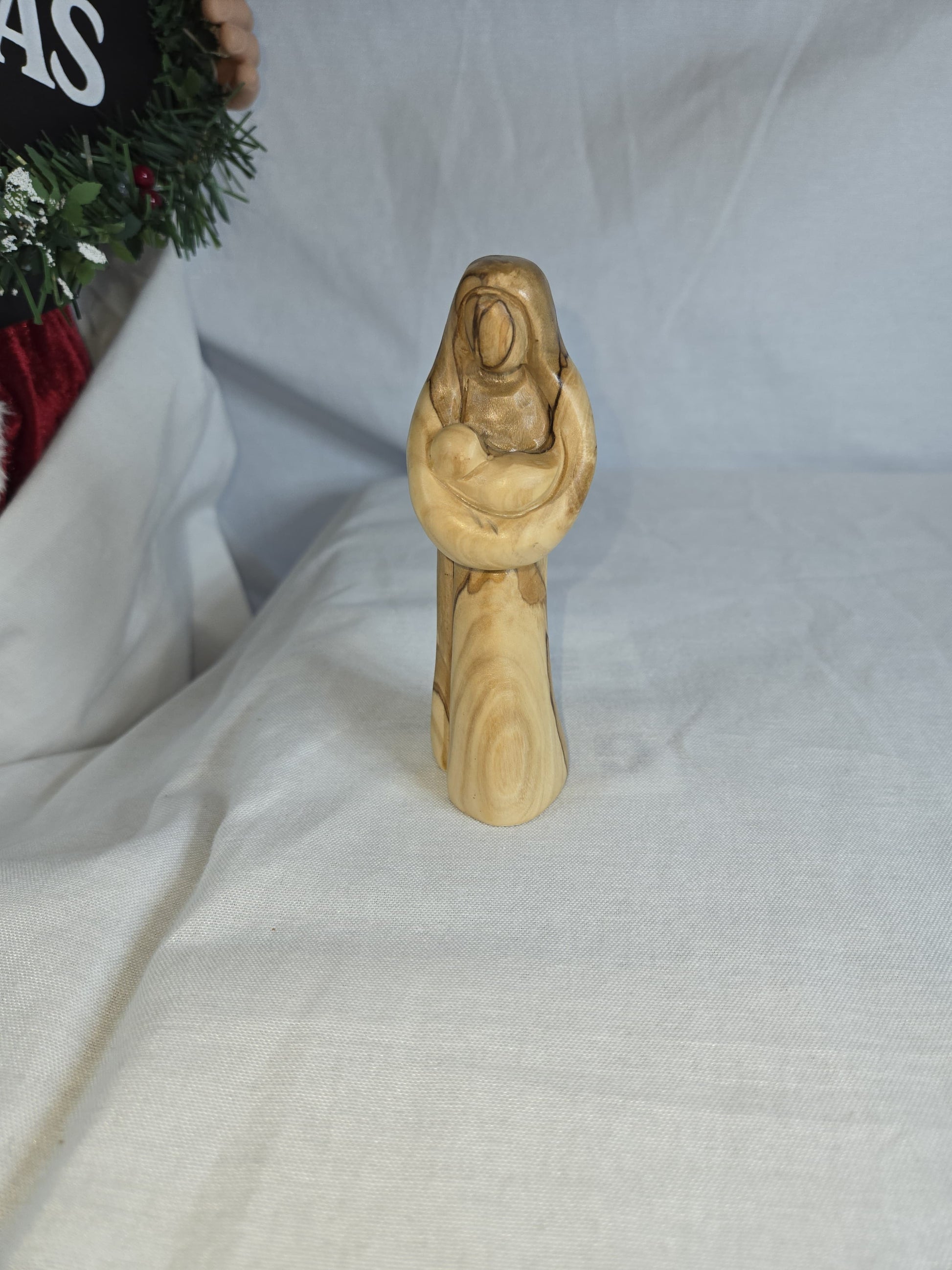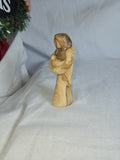 This is a hand-carved olive wood statue depicting the Virgin Mary holding Baby Jesus. Made from authentic olive wood, often sourced from the Holy Land. Hand-carved by artisans, showcasing the unique grain and rich tones of the wood. Represents a meaningful spiritual item, often used for religious decor or as a gift.