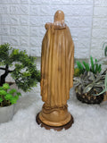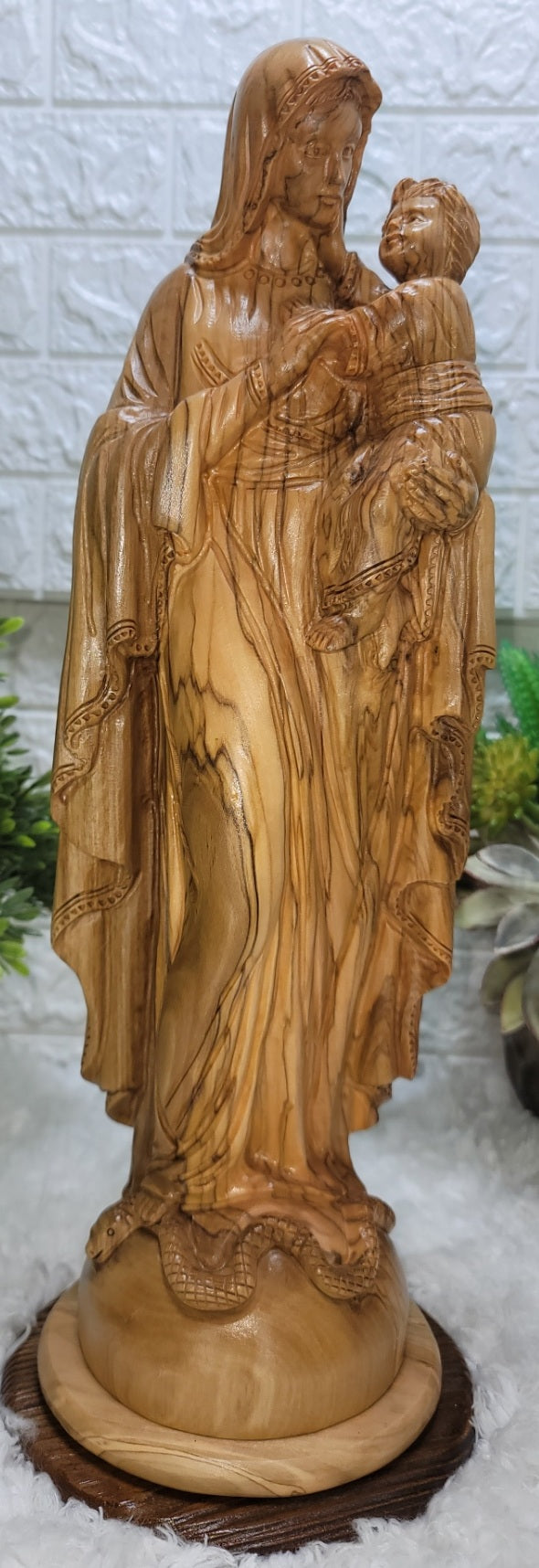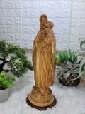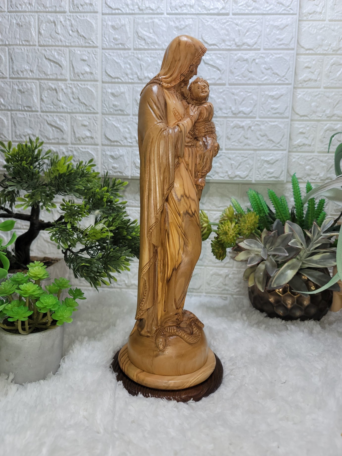 This is an olive wood statue depicting the Virgin Mary holding Baby Jesus. The statue is hand-carved from olive wood, known for its unique grain and durability. It portrays Mother Mary cradling Baby Jesus, a significant motif in Christian art. handrafted in Bethlehem, a region known for its olive wood artistry. This piece embodies religious artistry and the spiritual significance of the figures it represents within Christianity.