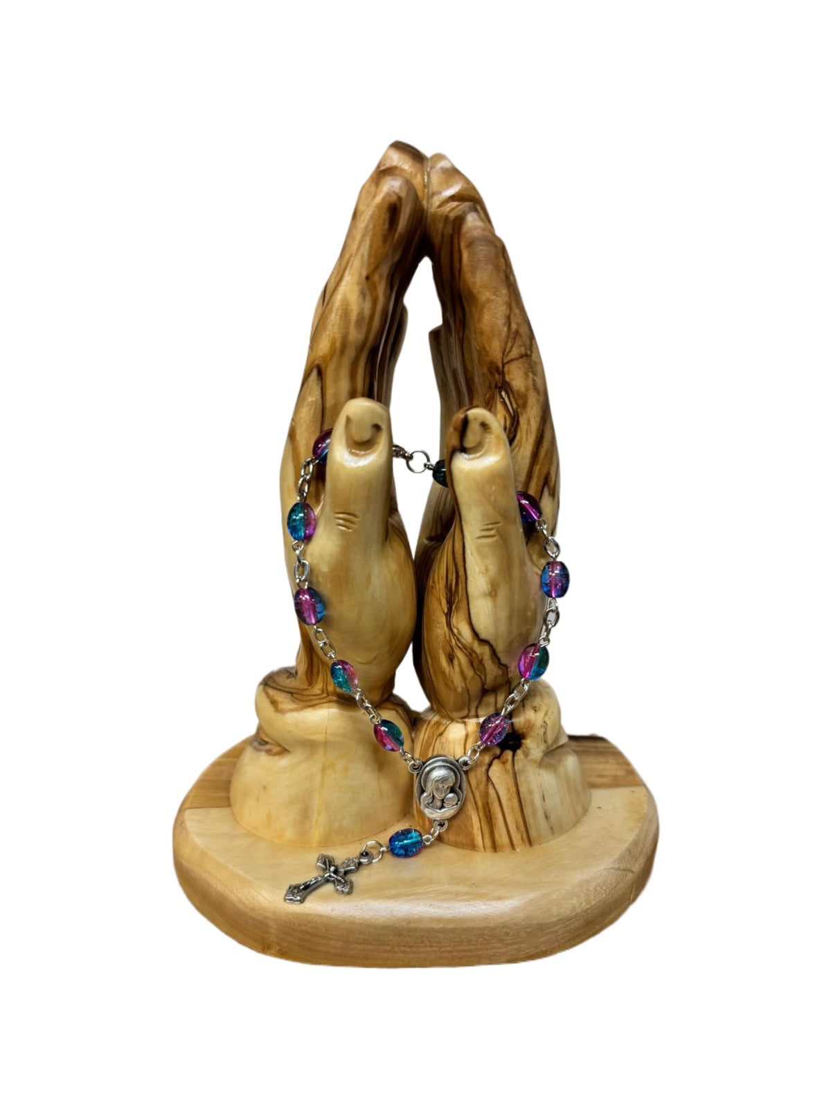 This radiant rosary bracelet features shimmering faceted beads in vibrant shades of blue and pink, symbolizing joy, hope, and spiritual beauty. The bracelet is accented with a silver-tone crucifix and a detailed saint medal centerpiece, making it both a devotional tool and an elegant accessory.