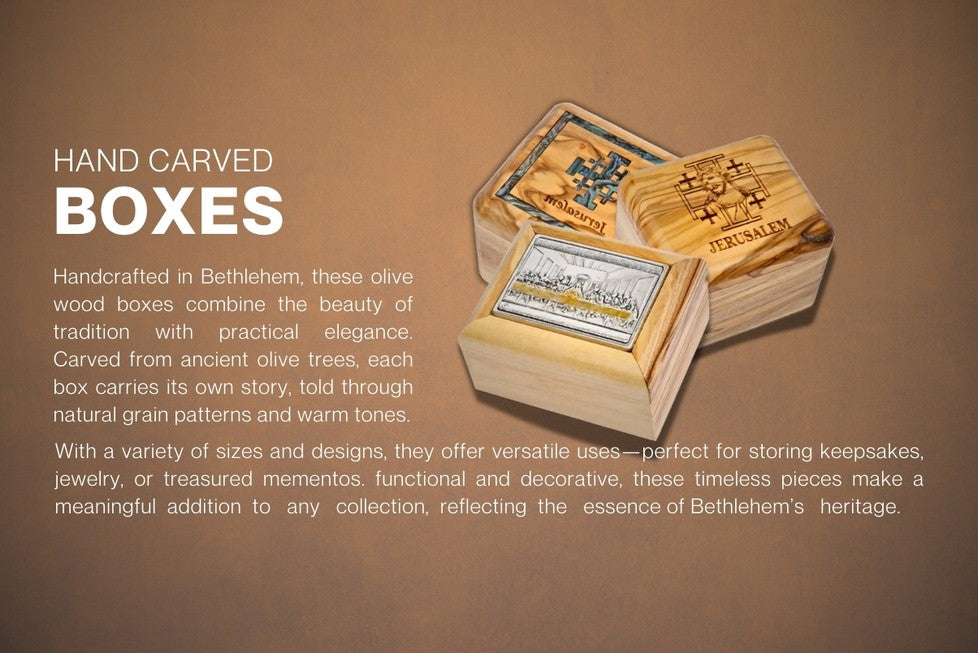 This hand-carved olive wood box showcases a detailed Jerusalem panorama design and a warm beige finish. Compact and functional, it is perfect for storing jewellery, rosaries, or small trinkets while serving as a decorative collectible with “Jerusalem” engraved for added charm. Size: 7X6 CM