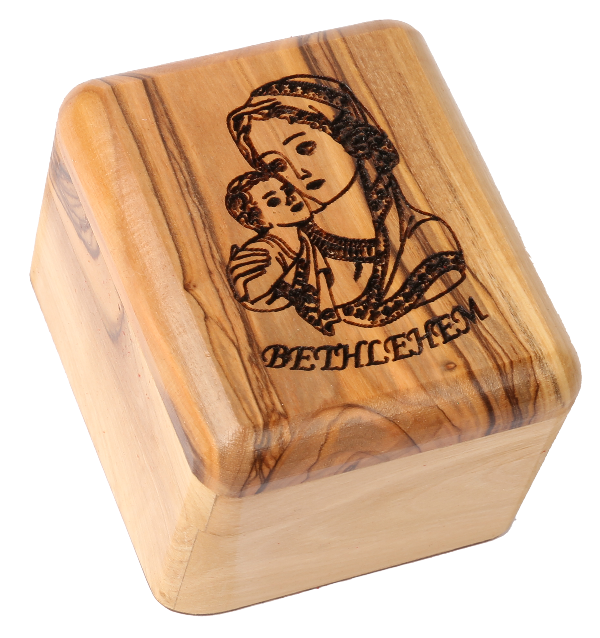 Hand-carved from authentic Jerusalem olive wood, this box features a detailed carving of Mary with Jesus and an engraved "Bethlehem". Perfect for storing rosaries or jewellery, it is a timeless keepsake reflecting Bethlehem's spiritual significance. Size: 7X6 CM