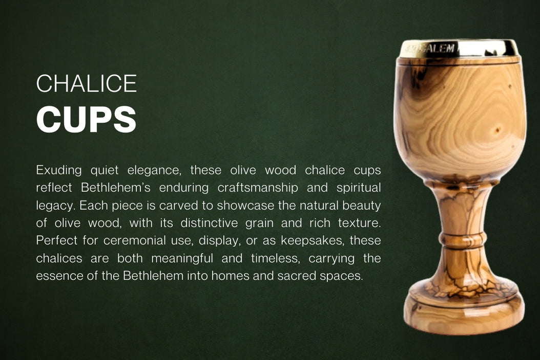This exquisite olive wood chalice cup features a finely laser-engraved depiction of the Last Supper, combining craftsmanship with natural beauty. Handcrafted in Bethlehem, it is a meaningful and elegant piece for sacred occasions or collections.
