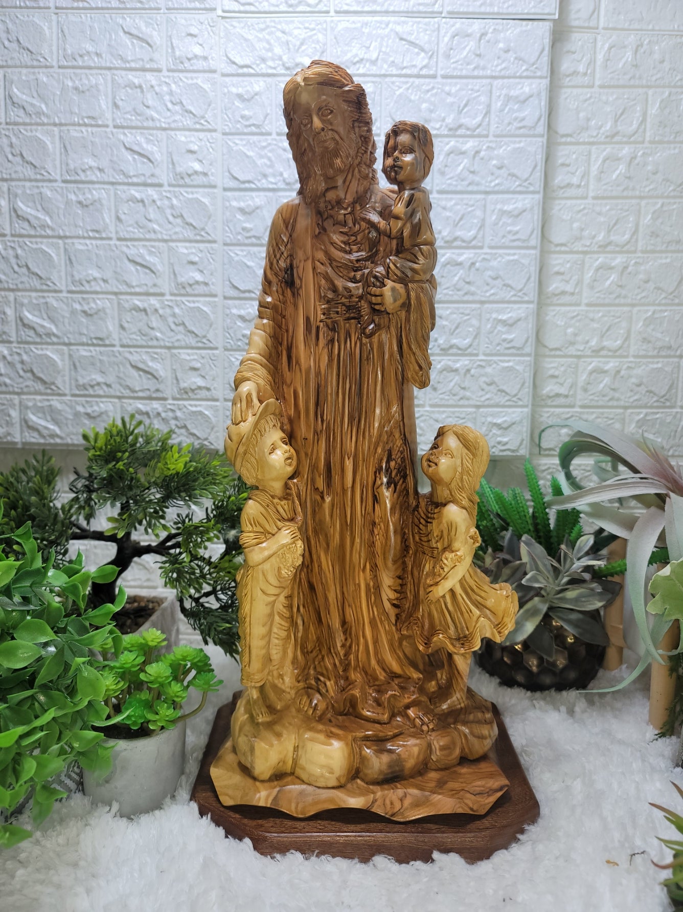 This type of statue is crafted from olive wood sourced from the Holy Land, particularly Bethlehem. It symbolizes Jesus' love for children and is a common religious decor piece for Christian homes or classrooms. It features a bearded Jesus figure, holding one child and with two other children looking up at him.