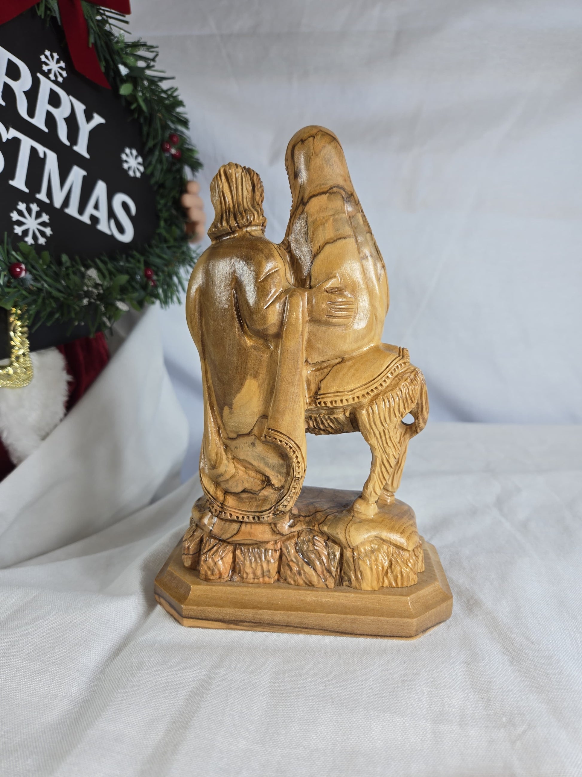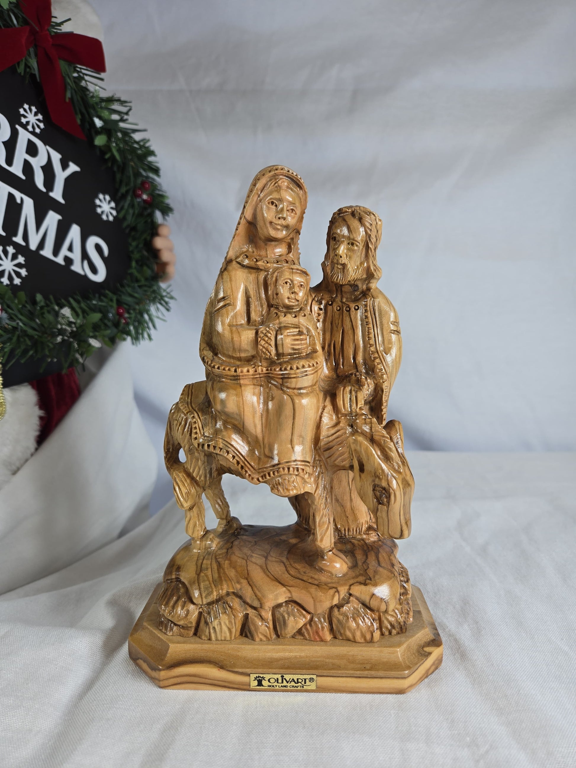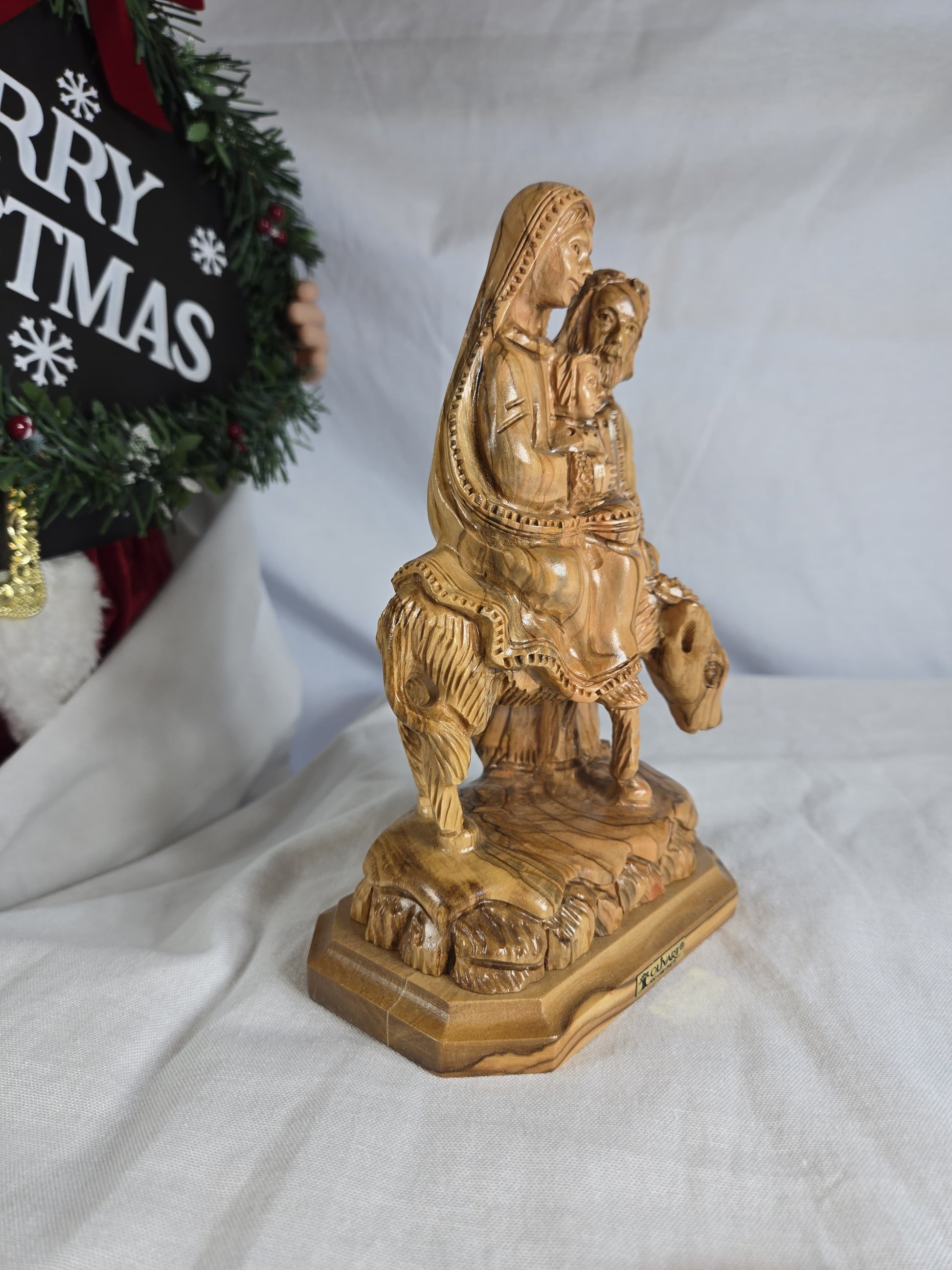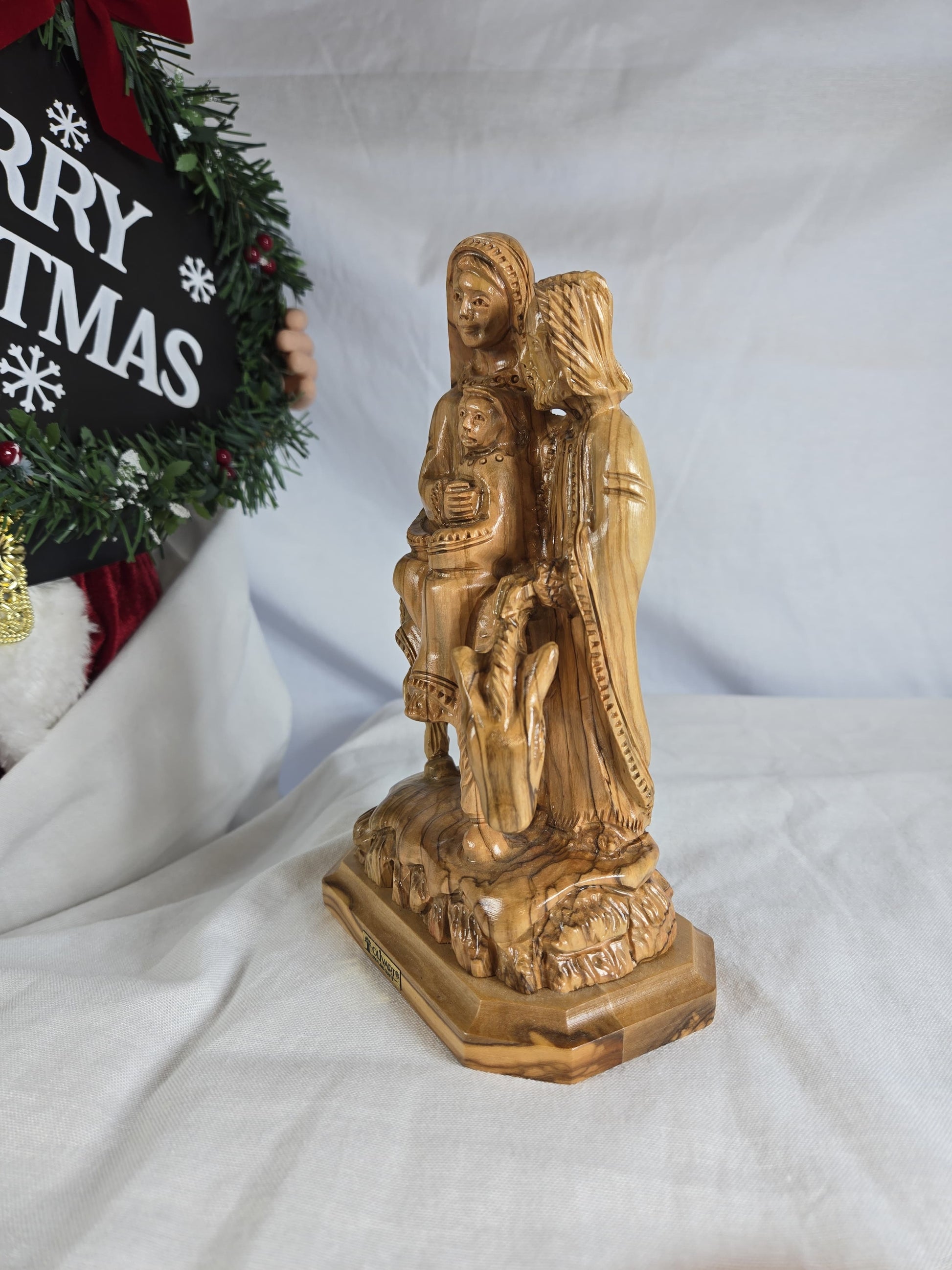 This olive wood carving of the Flight into Egypt, a biblical event where the Holy Family (Mary, Joseph, and baby Jesus) fled to Egypt to escape King Herod's persecution. The carving is handcrafted from olive wood, likely sourced from the Holy Land, specifically Bethlehem, the birthplace of Jesus. It illustrates Mary holding baby Jesus while riding a donkey, led by Joseph, as they journey to Egypt. This piece serves as a religious artifact and a representation of faith, often used for home décor or as a gift.