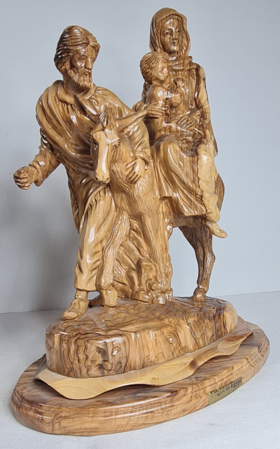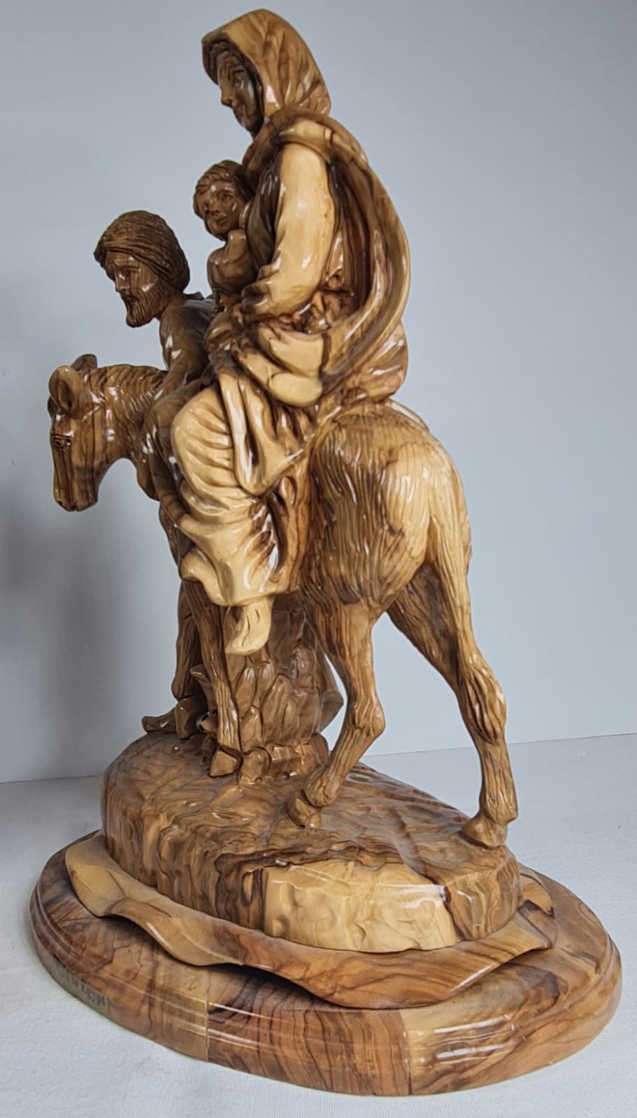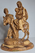 Olive wood sculpture titled "The Flight to Egypt," a scene from the New Testament's Gospel of Matthew (Matthew 2:13). The sculpture portrays Mary, Joseph, and the infant Jesus fleeing to Egypt to escape King Herod's persecution.