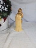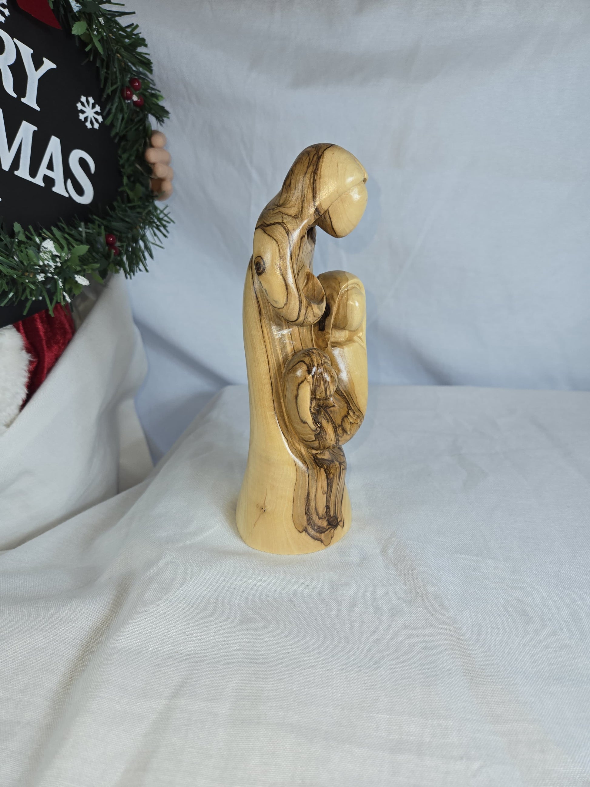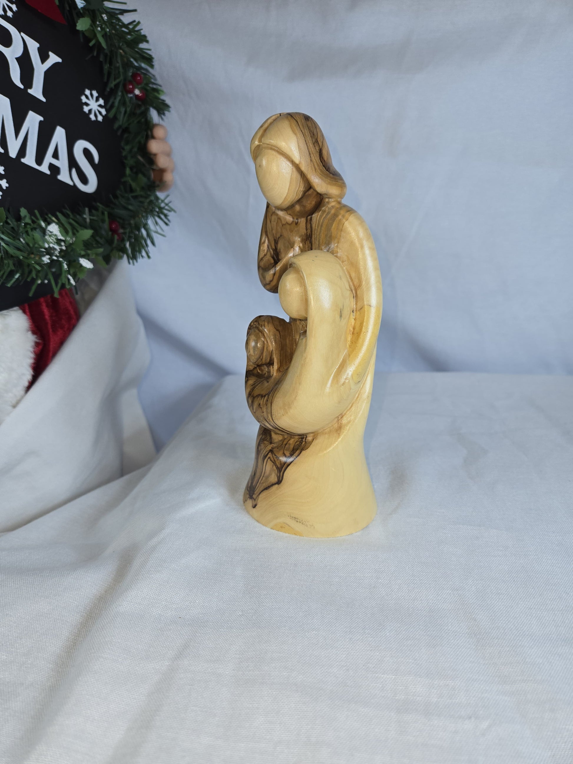 This is an Olive Wood Holy Family Sculpture, hand-carved by Christian artisans in Bethlehem. It depicts the Holy Family (Joseph, Mary, and baby Jesus) in an abstract, faceless style, allowing for personal interpretation. The sculpture is made from sustainably harvested olive wood, known for its unique grain and color, making each piece an original. Size: 8''