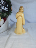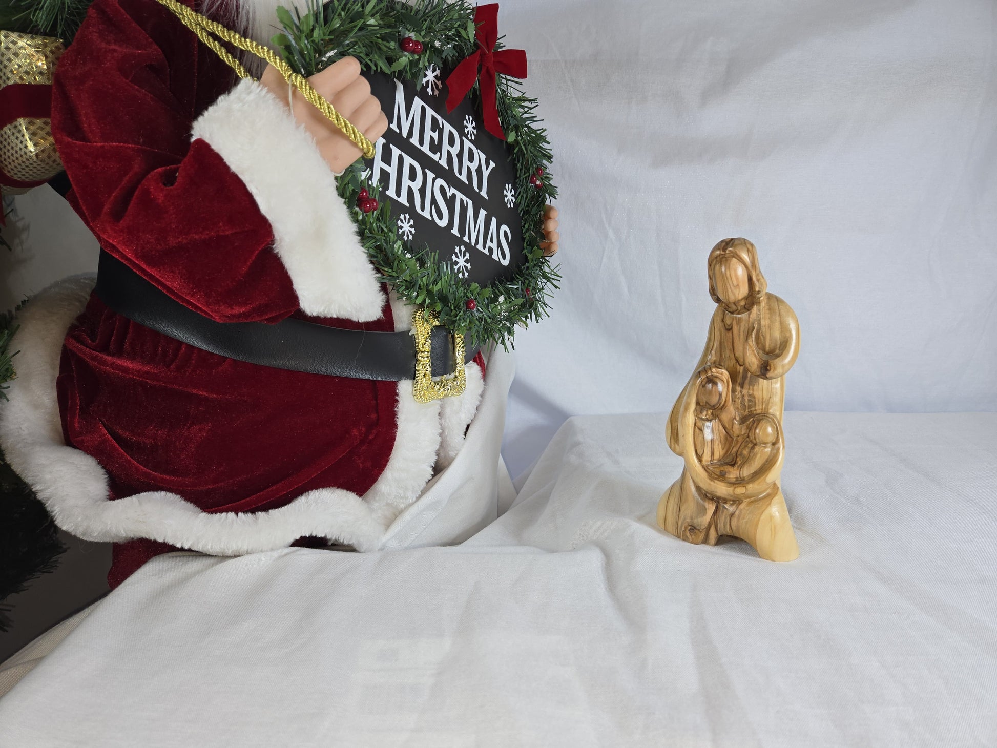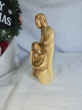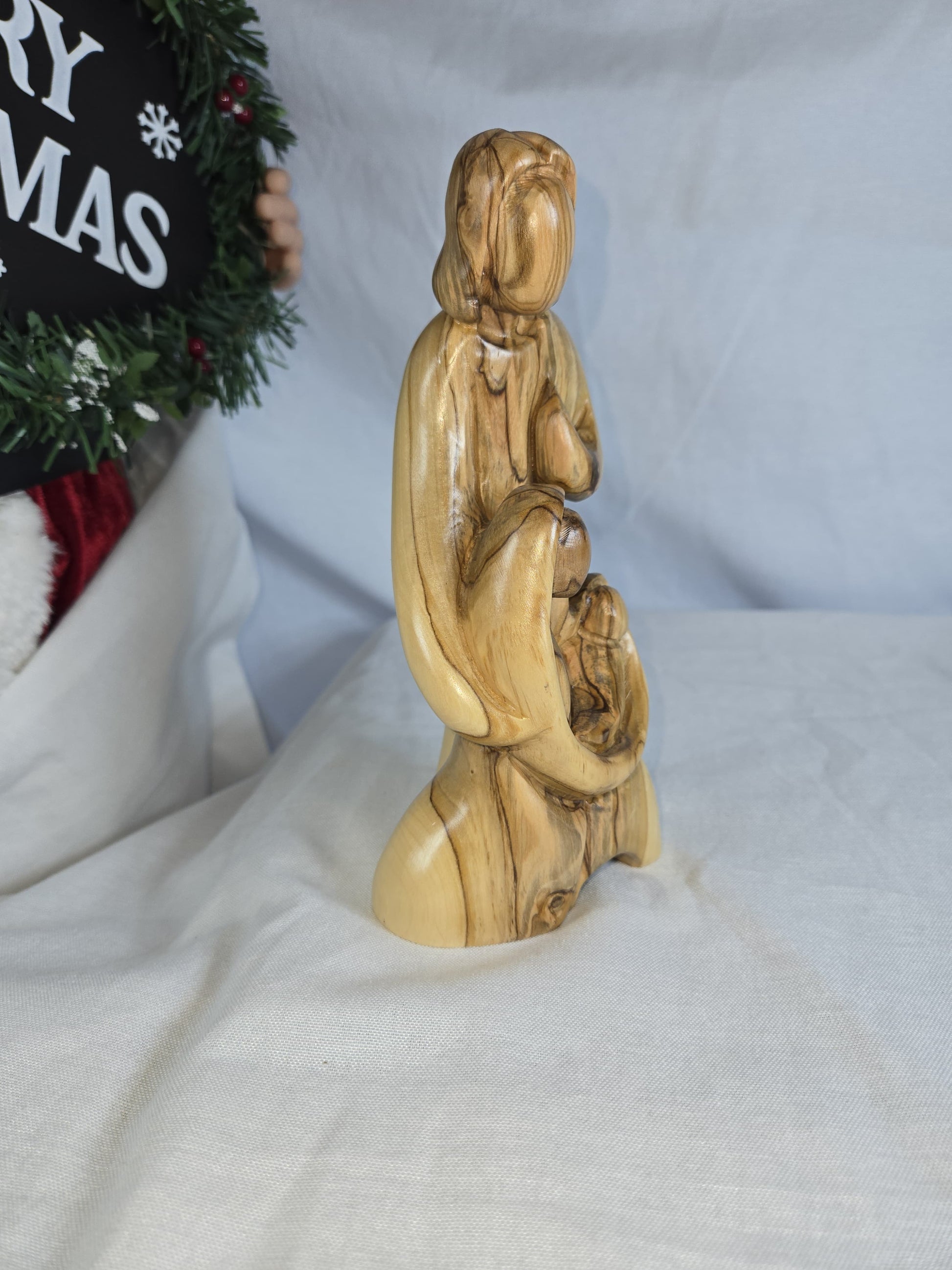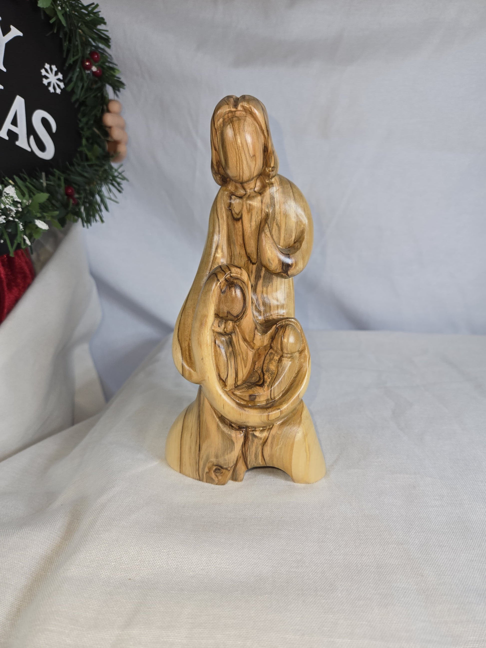 This olive wood statue depicting the Holy Family (Joseph, Mary, and baby Jesus). Hand-carved from olive wood sourced from the Holy Land, often Bethlehem. Represents the Holy Family, a central theme in Christian art and faith. It features a modern, abstract, or faceless carving style, emphasizing the forms and grain of the wood. Size: 8''