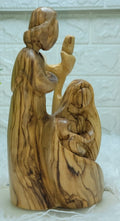 An olive wood Holy Family statue, hand-carved in Bethlehem. This statue depicts Mary, Joseph, and baby Jesus, often referred to as the Holy Family. It is crafted from authentic olive wood, known for its unique grain and natural variations. The statue are made by Christian artisans in the Holy Land, continuing a long tradition of olive wood carving. Size: 9''