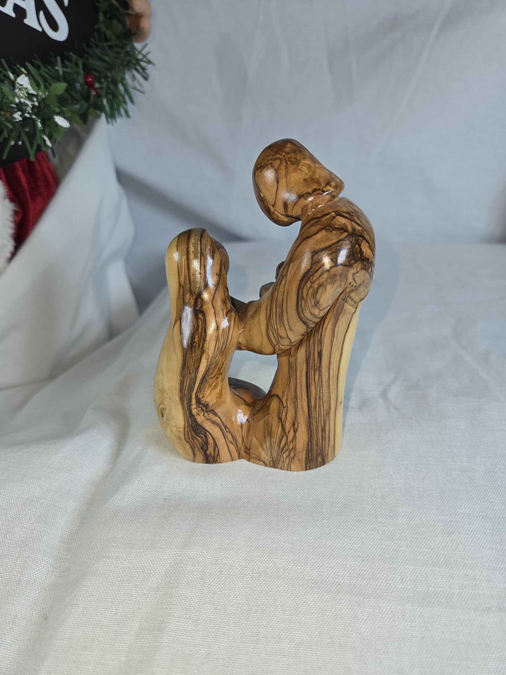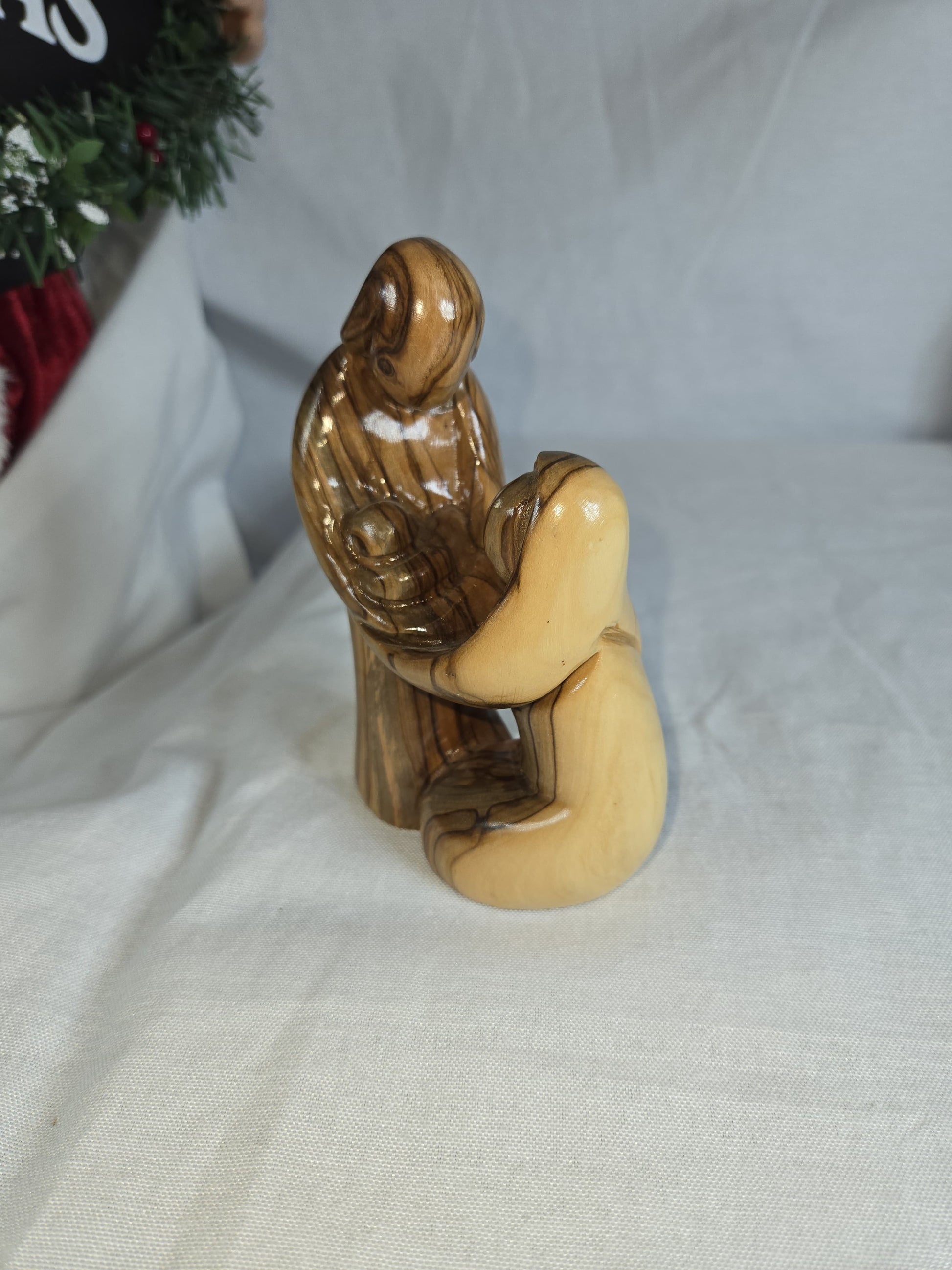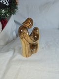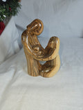 An olive wood carving of the Holy Family, a common religious artifact. The sculpture portrays Joseph, Mary, and the infant Jesus in a loving embrace, often representing the Nativity scene. Handcrafted from olive wood, particularly in the Holy Land, by Christian artisans. The unique grain and variations in the olive wood mean that no two pieces are exactly alike. Size: 9''