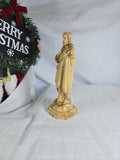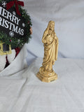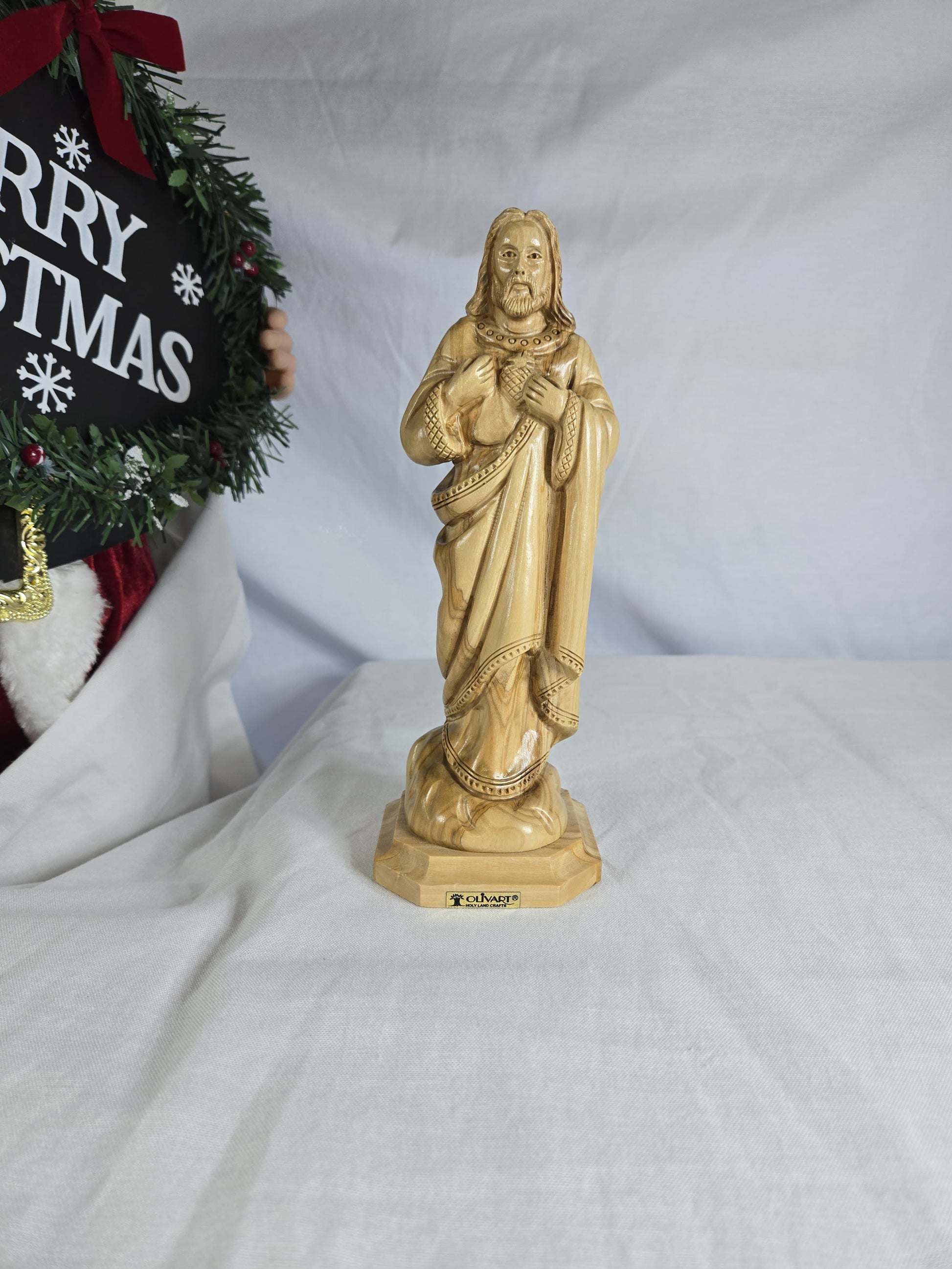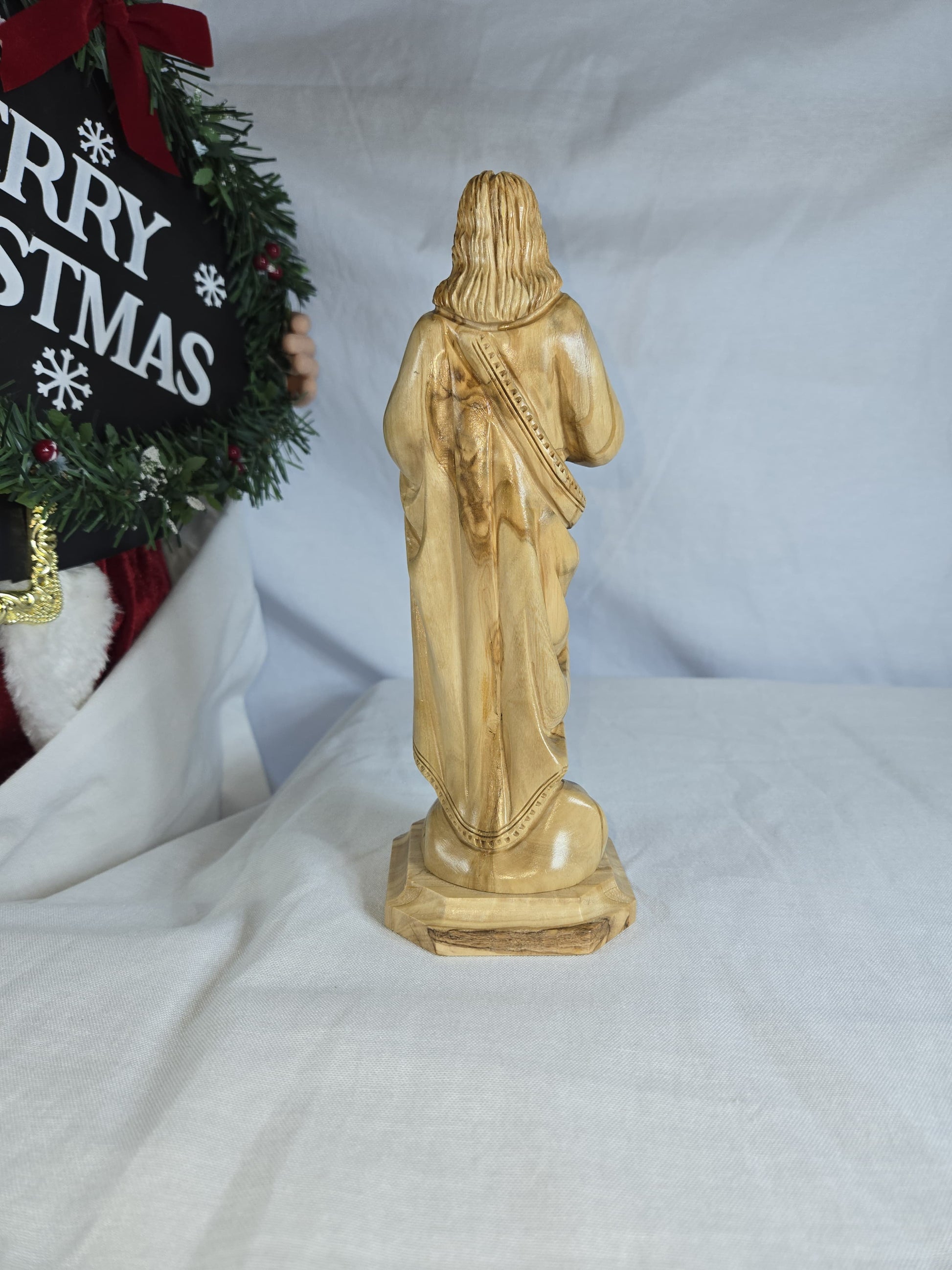 This is an olive wood statue depicting Jesus Christ, likely crafted in the Holy Land. Made from genuine olive wood, often sourced from pruning of olive trees in the Holy Land. These statues are typically hand-carved by Christian families and artisans in Bethlehem, continuing a long-standing tradition.