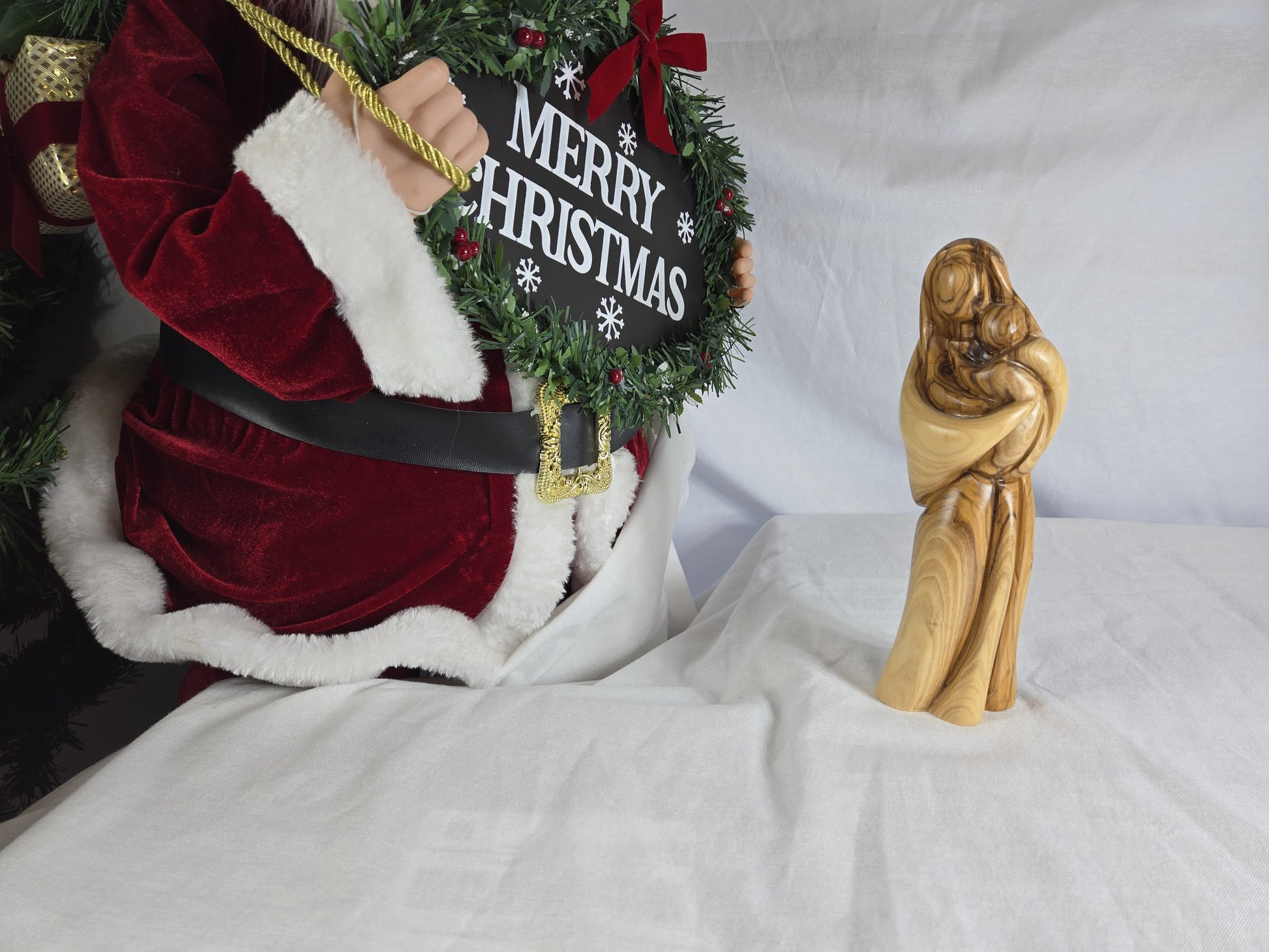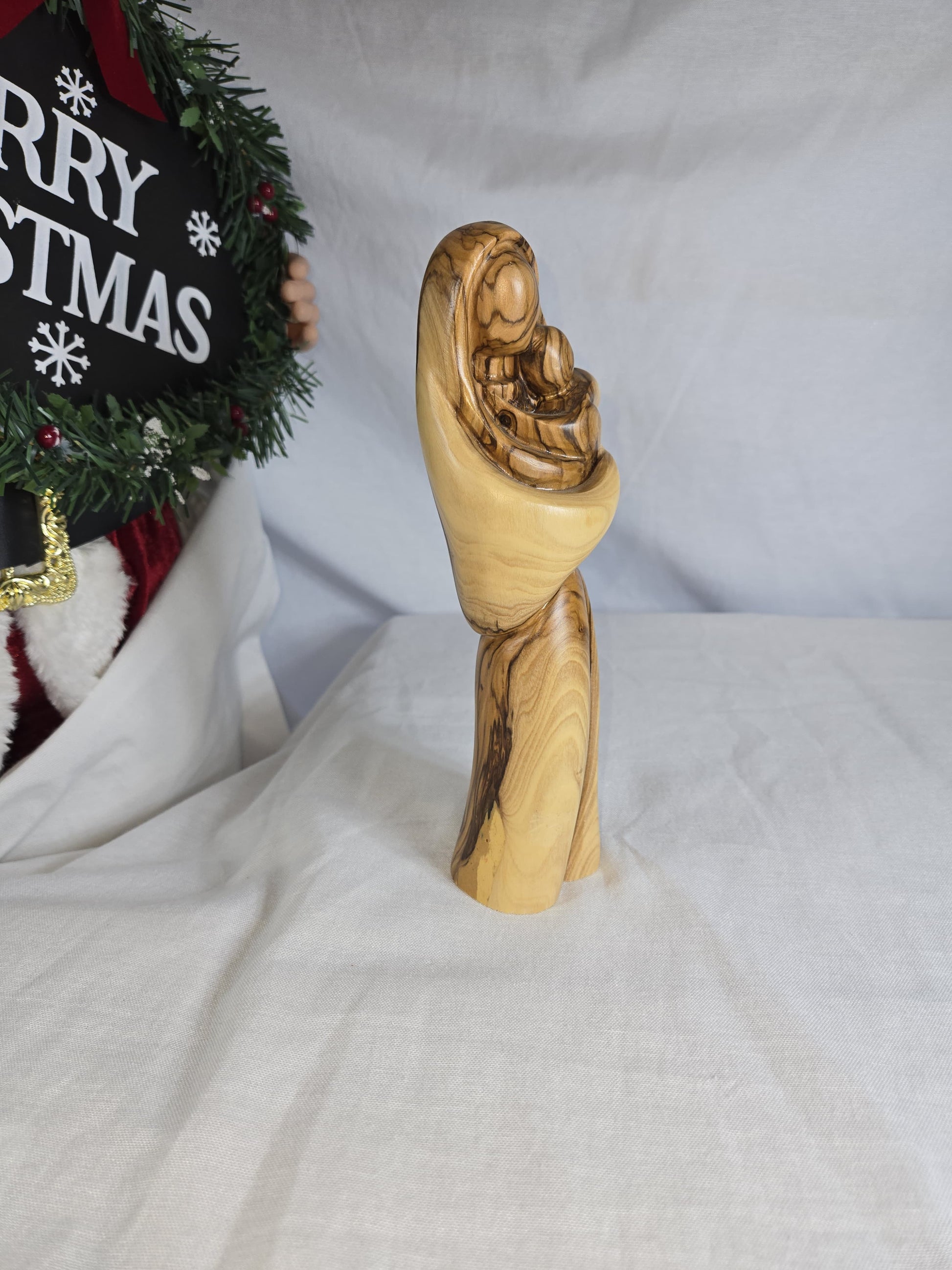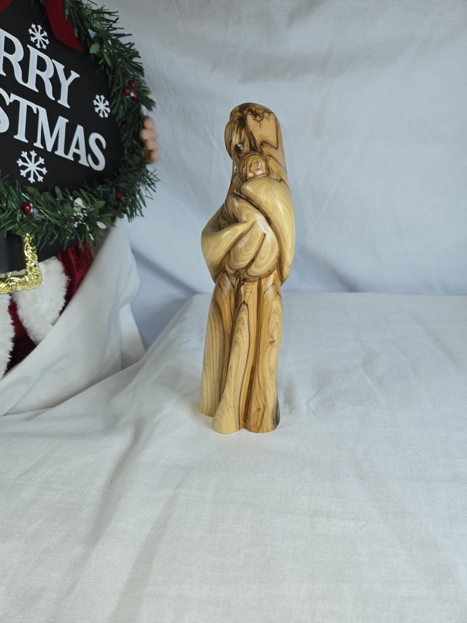 This is a hand-carved olive wood statue depicting the Virgin Mary holding Baby Jesus. It is crafted by Christian artisans, typically from Bethlehem in the Holy Land. The statue is often referred to as "Faceless Virgin Mary holding Baby Jesus" due to its smooth, undefined facial features, which are meant to emphasize the spiritual connection and love between mother and child rather than individual likeness. Each piece is unique due to the natural variations in the olive wood's grain and color.