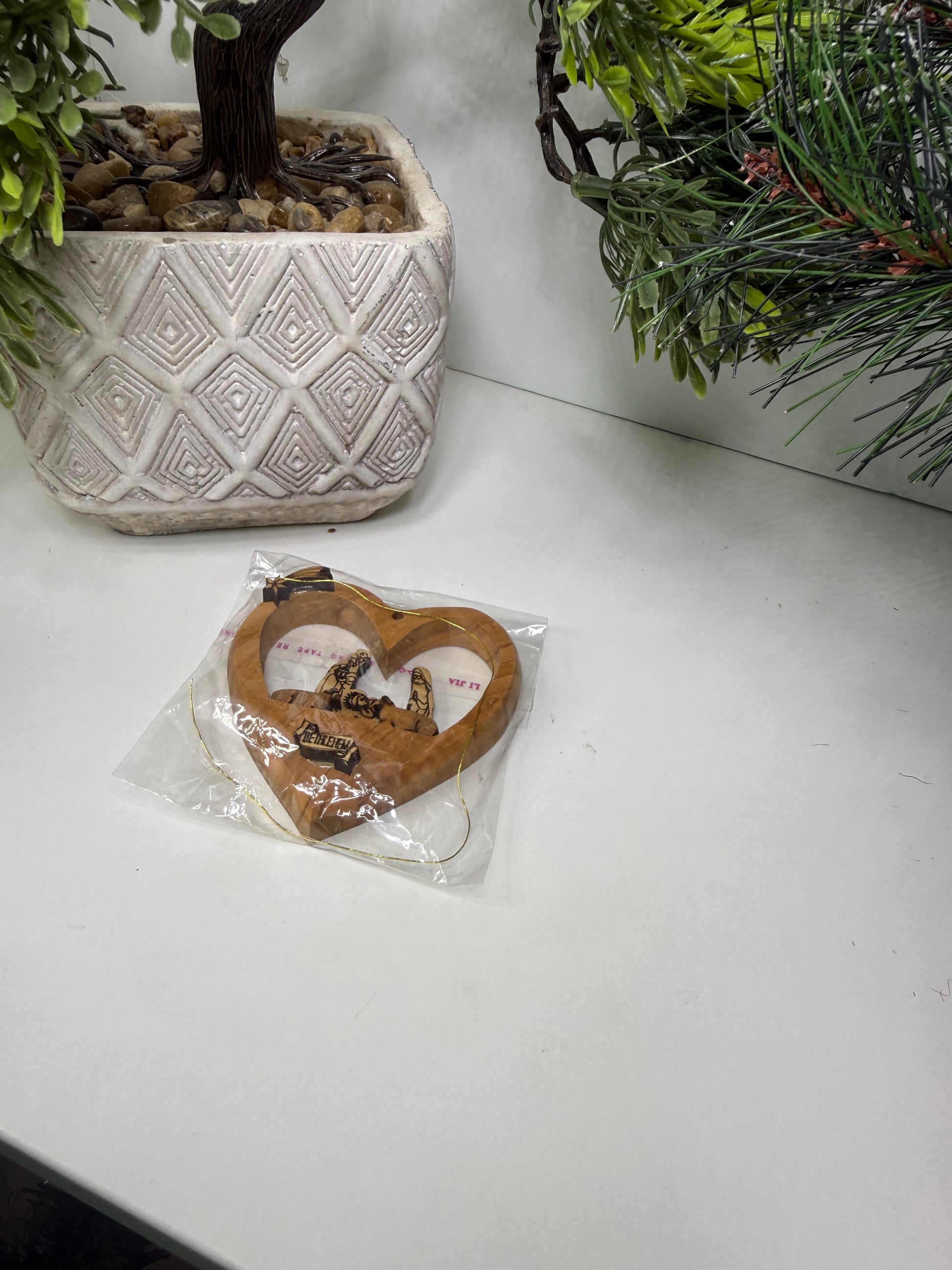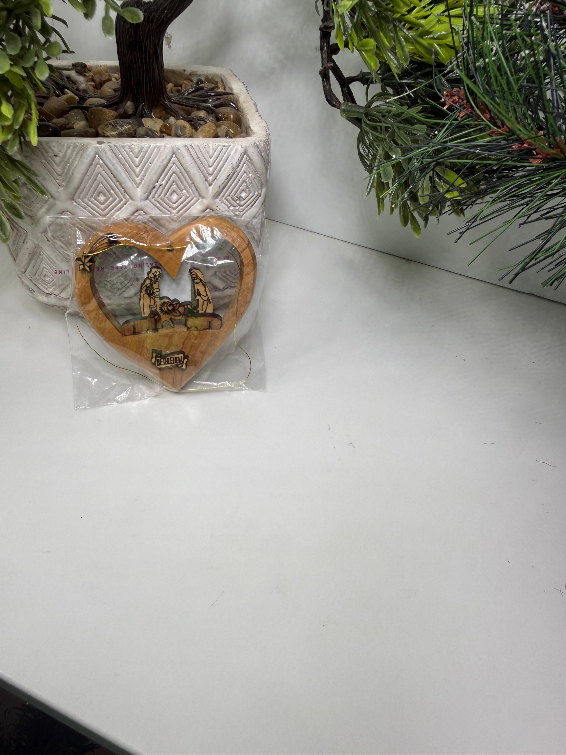 This beautifully crafted ornament features a detailed Nativity scene enclosed within a heart, intricately carved from olive wood. Handcrafted in Bethlehem, it is a meaningful and elegant addition to your holiday décor. Size: 8.5X8CM