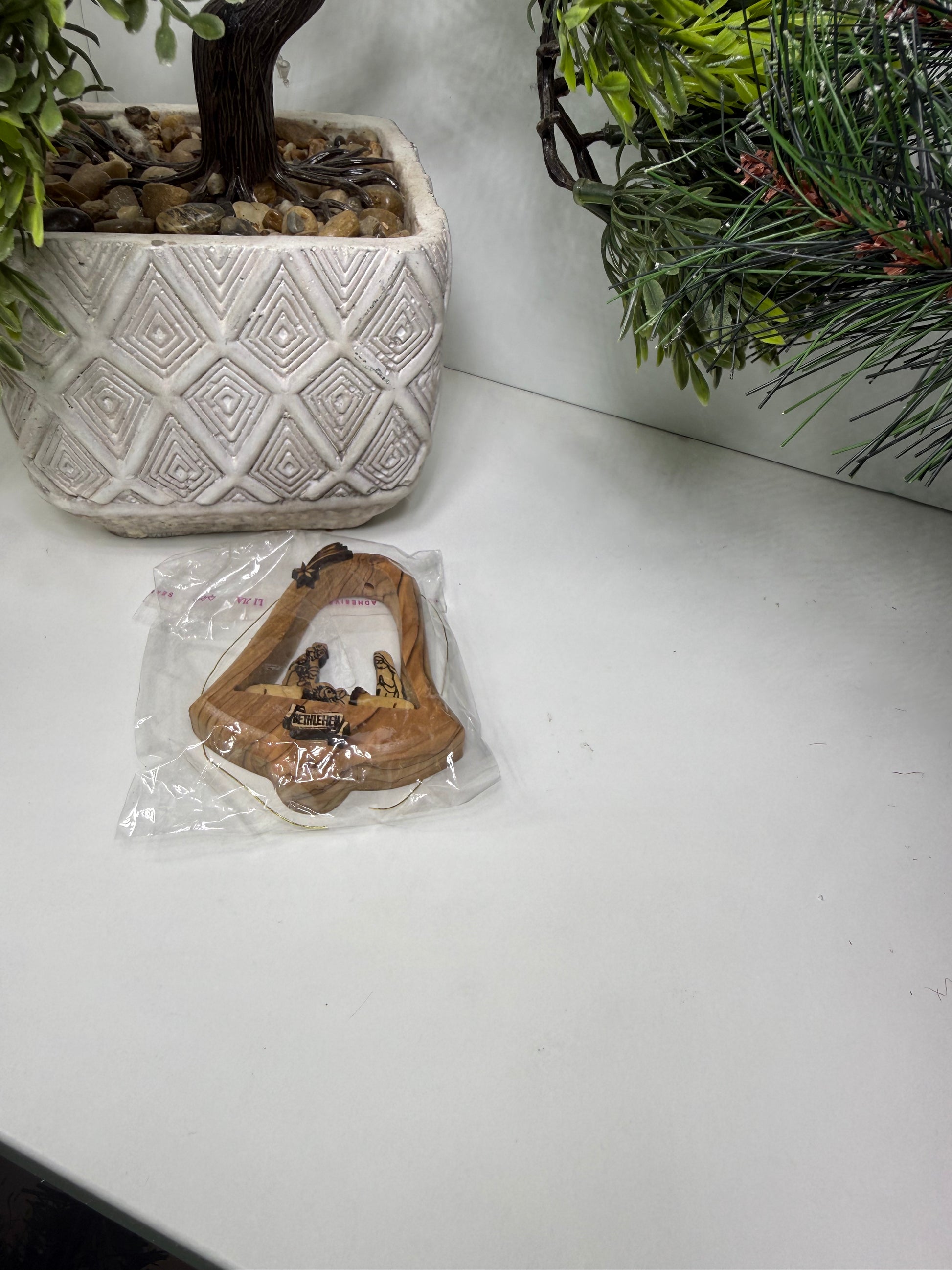 This beautifully crafted ornament features a detailed Nativity scene enclosed within a bell design, intricately carved from olive wood. Handcrafted in Bethlehem, it is a meaningful and elegant addition to your holiday décor. Size: 9X8CM