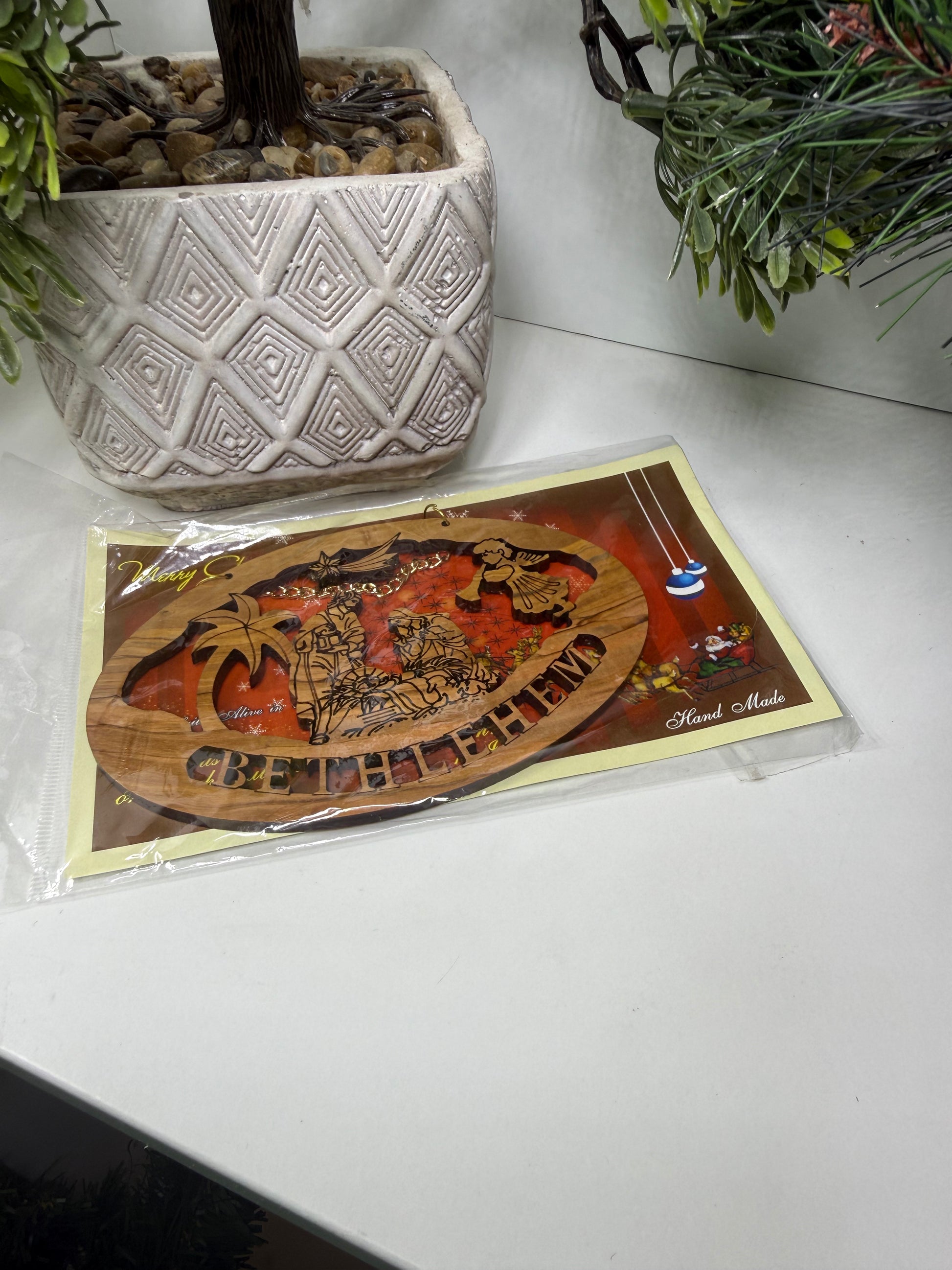 This beautifully crafted olive wood ornament features a detailed Nativity scene carved within a plaque. A timeless and meaningful addition to your holiday décor, it celebrates the essence of the Christmas story. Size: 15CM