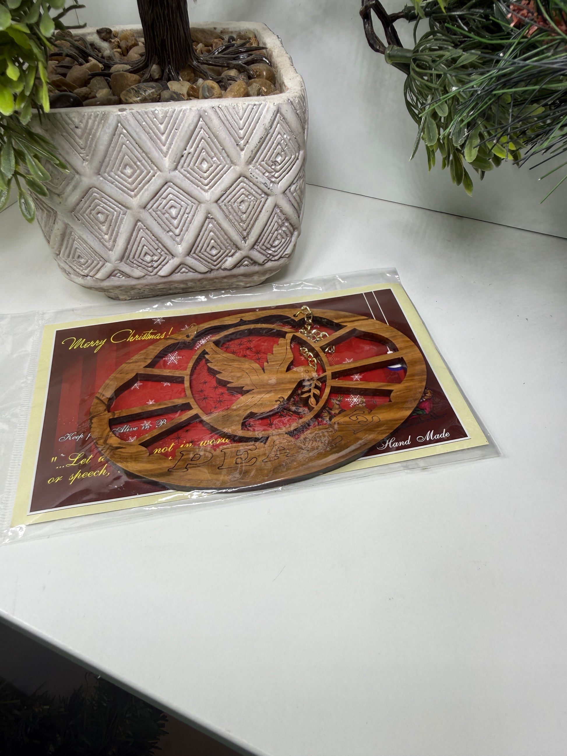This beautifully crafted olive wood plaque ornament features a dove along with a laser-engraved "peace" word in an elegant design. A meaningful addition to your holiday décor, it embodies hope and harmony. Size: 15CM