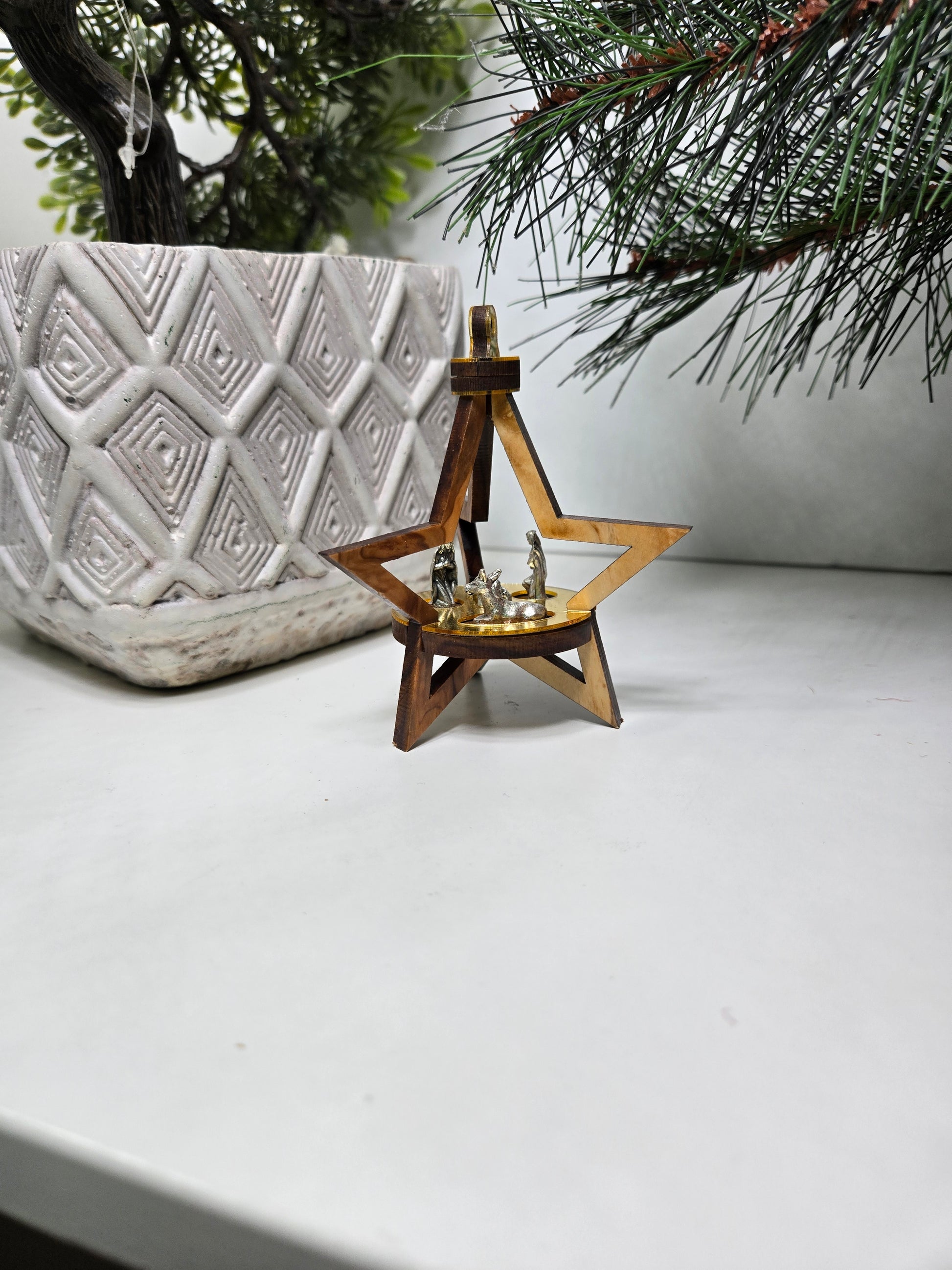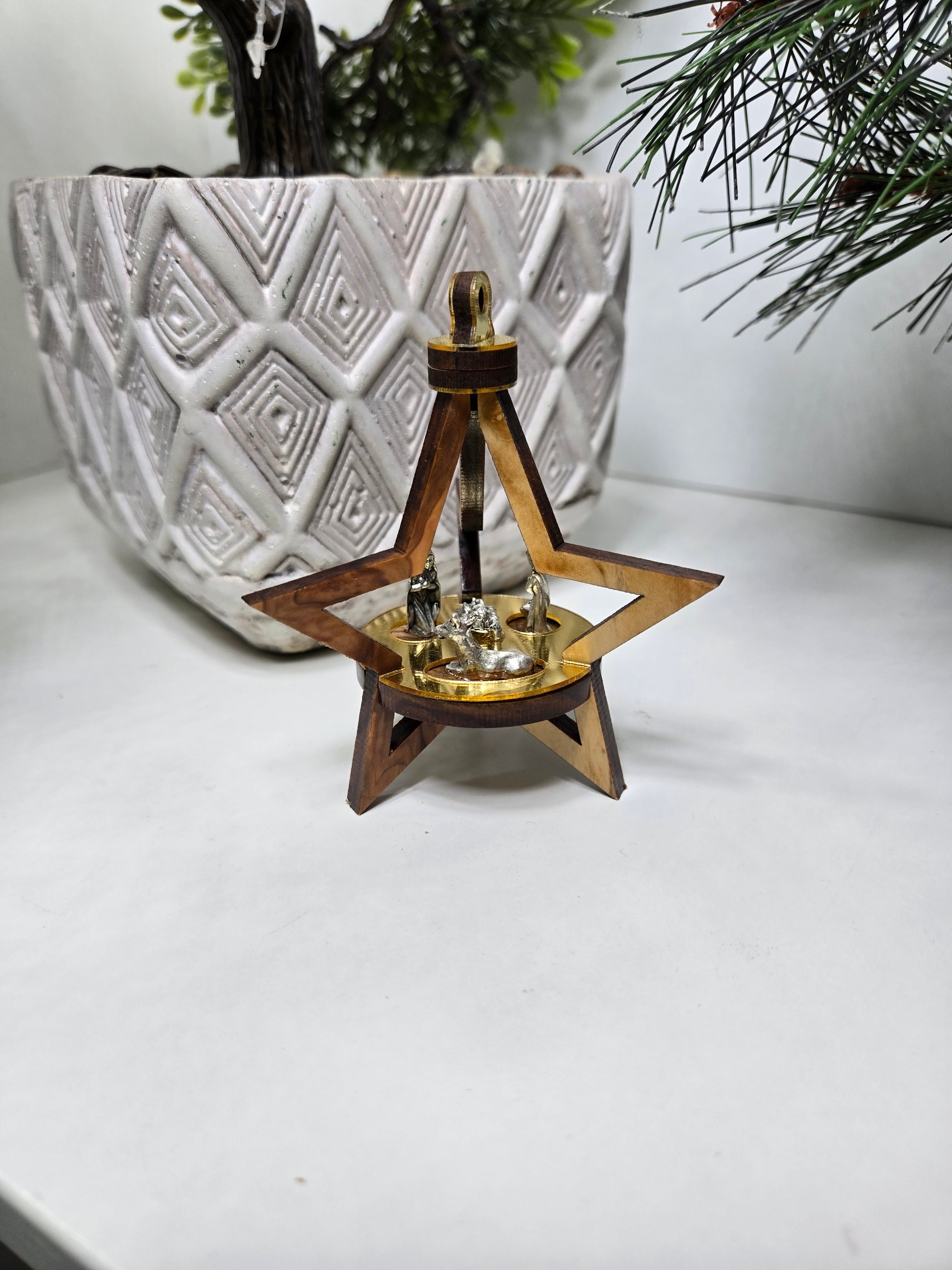 Olive Wood Ornament_ 3D Star with Silver Oxide Figurines