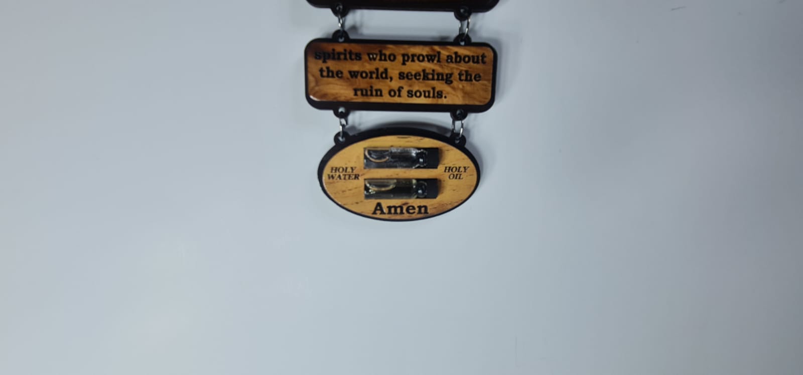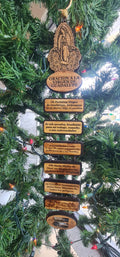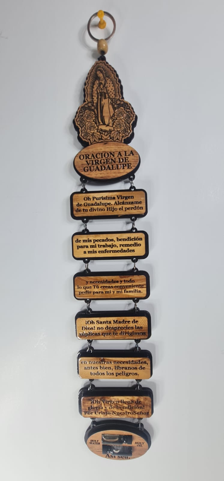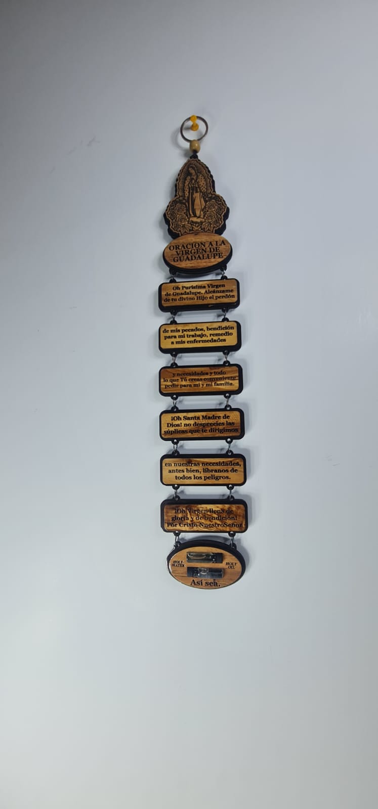 This wooden plaque featuring the Virgin of Guadalupe. The plaque includes an image of the Virgin of Guadalupe and a prayer in Spanish dedicated to her. The prayer asks for forgiveness of sins, blessings for work, and remedies, invoking the divine Son through the Virgin of Guadalupe. The Virgin of Guadalupe is a Catholic title of the Blessed Virgin Mary associated with Marian apparitions in Mexico in 1531. The image on the plaque is a common representation of the venerated image enshrined in the Basilica of Our Lady of Guadalupe in Mexico City. Size: 17x4x1