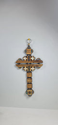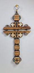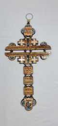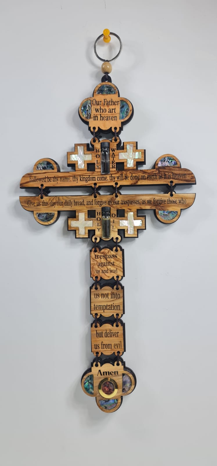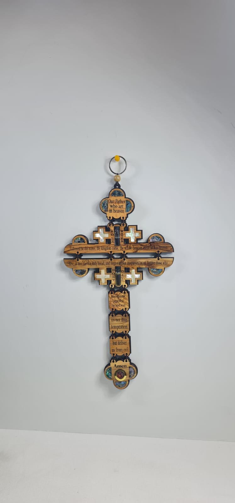 This is an olive wood Lord's Prayer wall hanging cross. It is handcrafted from genuine olive wood in Bethlehem, the Holy Land. The Lord's Prayer is laser engraved in English across the different sections of the cross. The segments are held together by a wire and decorated with mother-of-pearl or abalone shell inlays