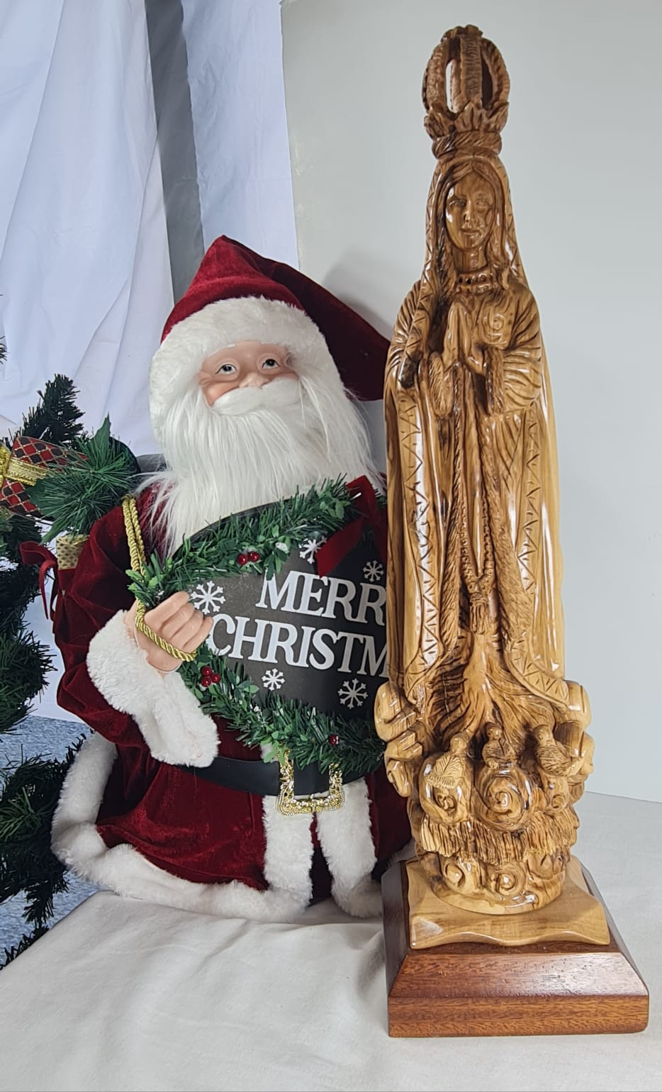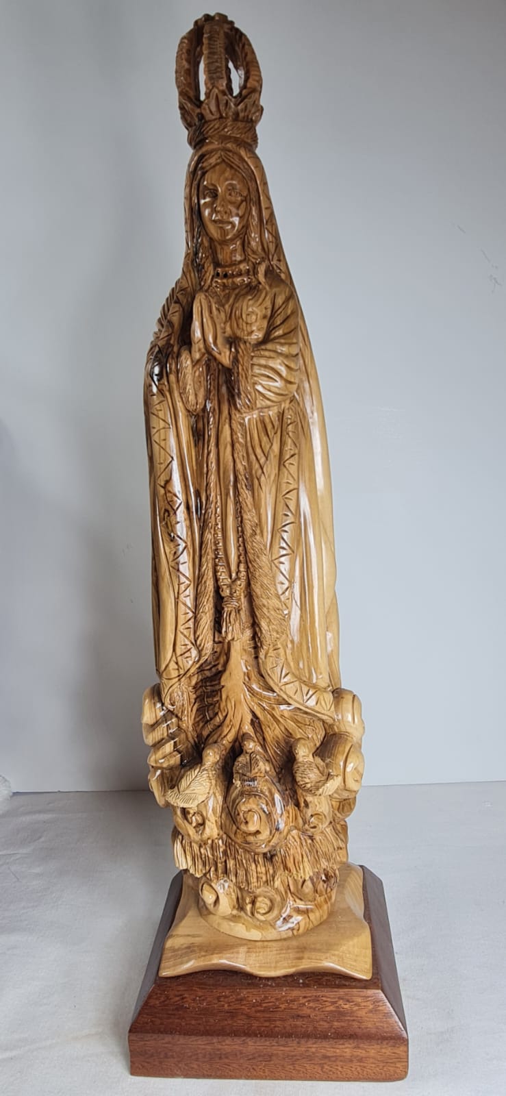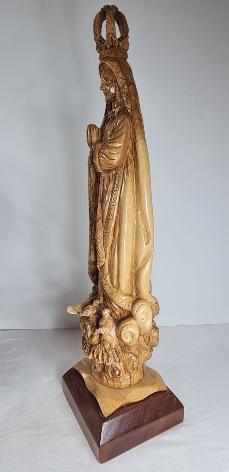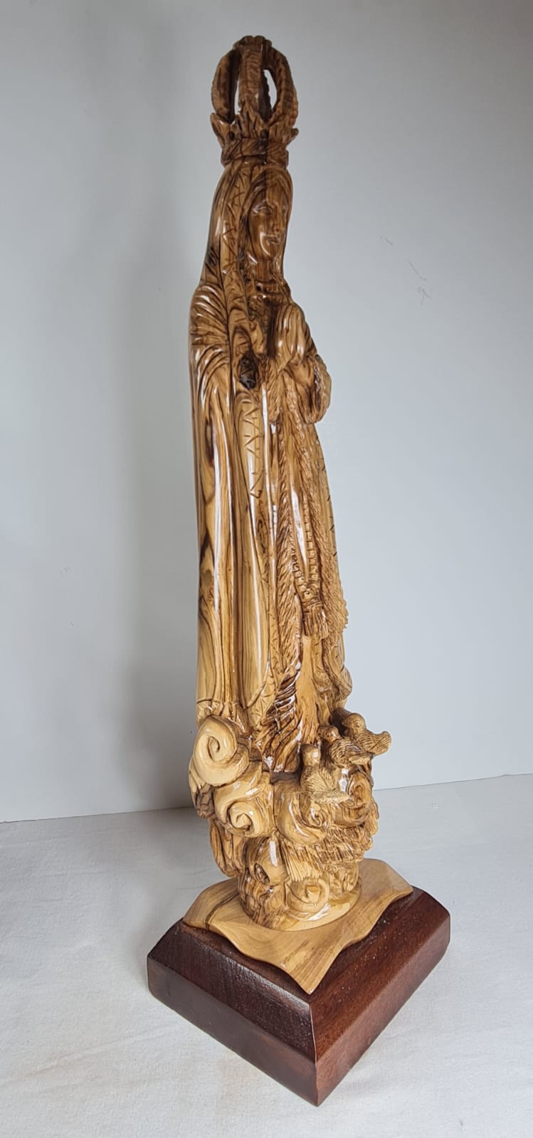 This is an olive wood statue of Our Lady of Fatima, hand-carved in Bethlehem. It is crafted from a single piece of olive wood and placed on a mahogany base. The statue depicts the Virgin Mary, often shown standing on clouds, holding roses, and wearing a crown, symbolizing her glory and nobility. it's made by Christian artisans in Bethlehem, using local olive wood from the Holy Land.