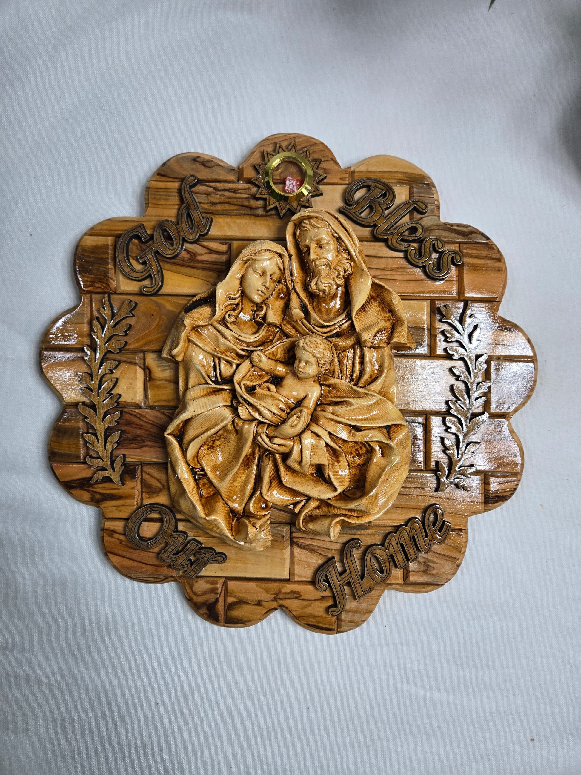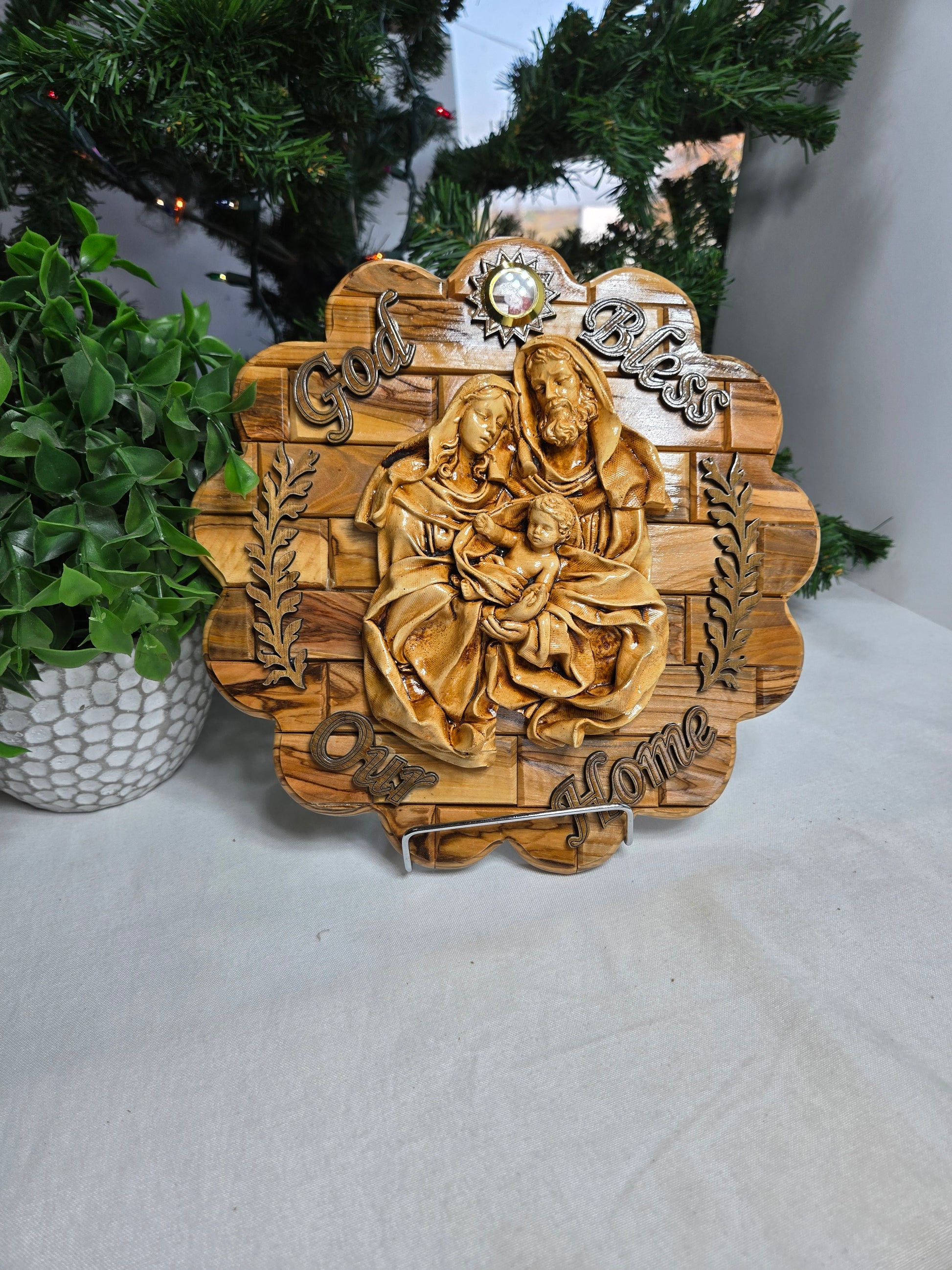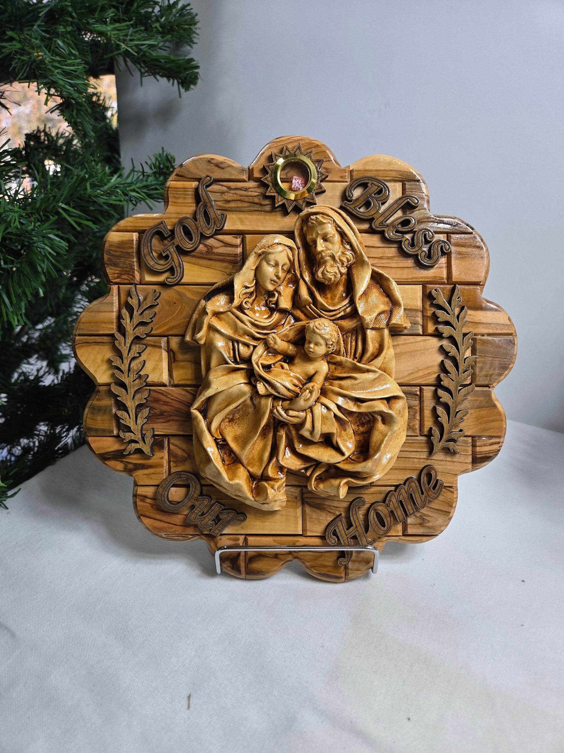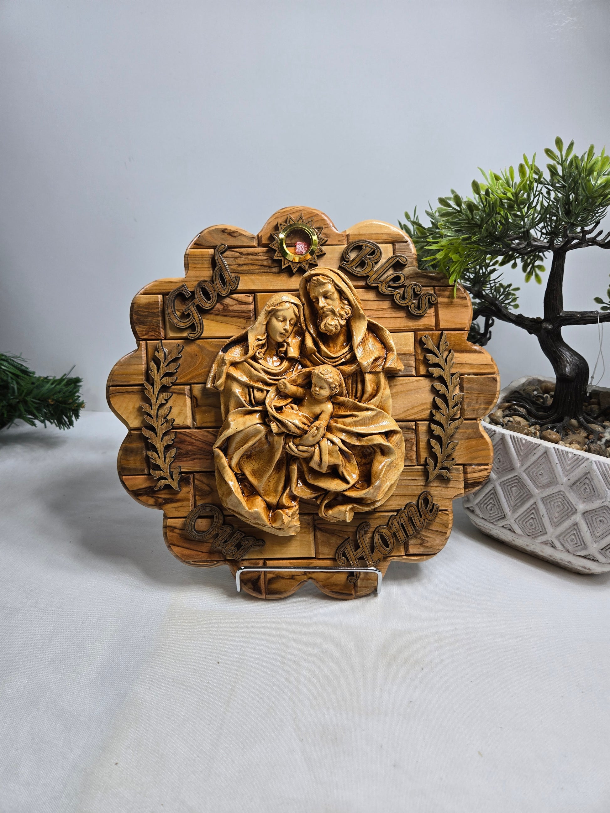 Olive Wood Holy Family Wall Plaque with a "God Bless Our Home" inscription. This plaque is handcrafted by artisans in the Bethlehem area of the Holy Land, often by Christian families who rely on these sales for their livelihood. It typically features a relief image of the Holy Family (Jesus, Mary, and St. Joseph). Some versions may include inlaid incense or stones from the Holy Land.