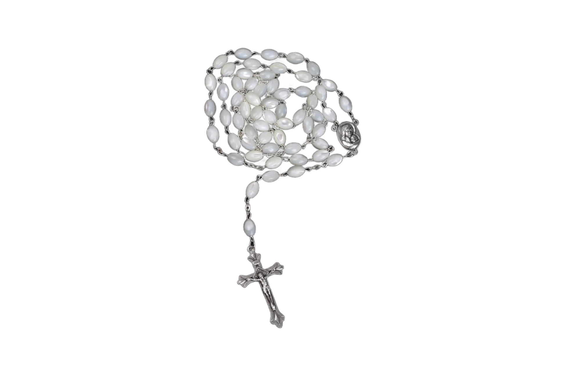 This elegant mother of pearl rosary features smooth beads, a Virgin Mary centerpiece containing Jerusalem soil, a silver oxide cross, and a durable metal chain. A meaningful and timeless companion for prayer and devotion. Size: 45CM