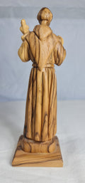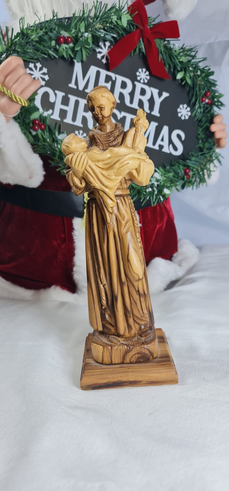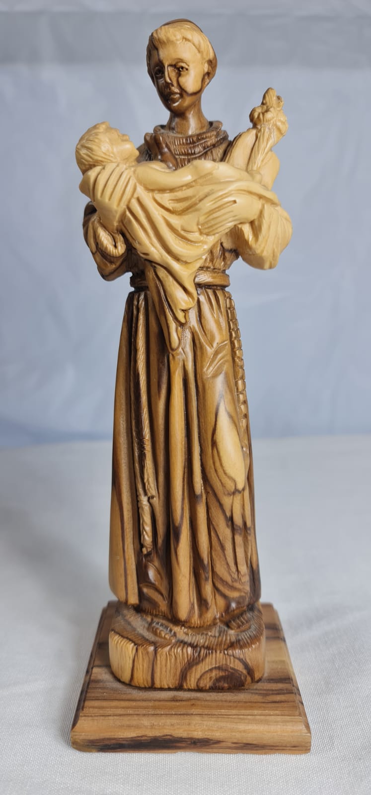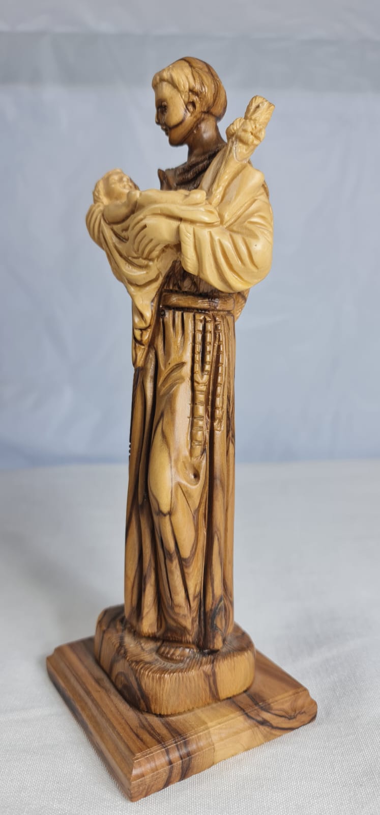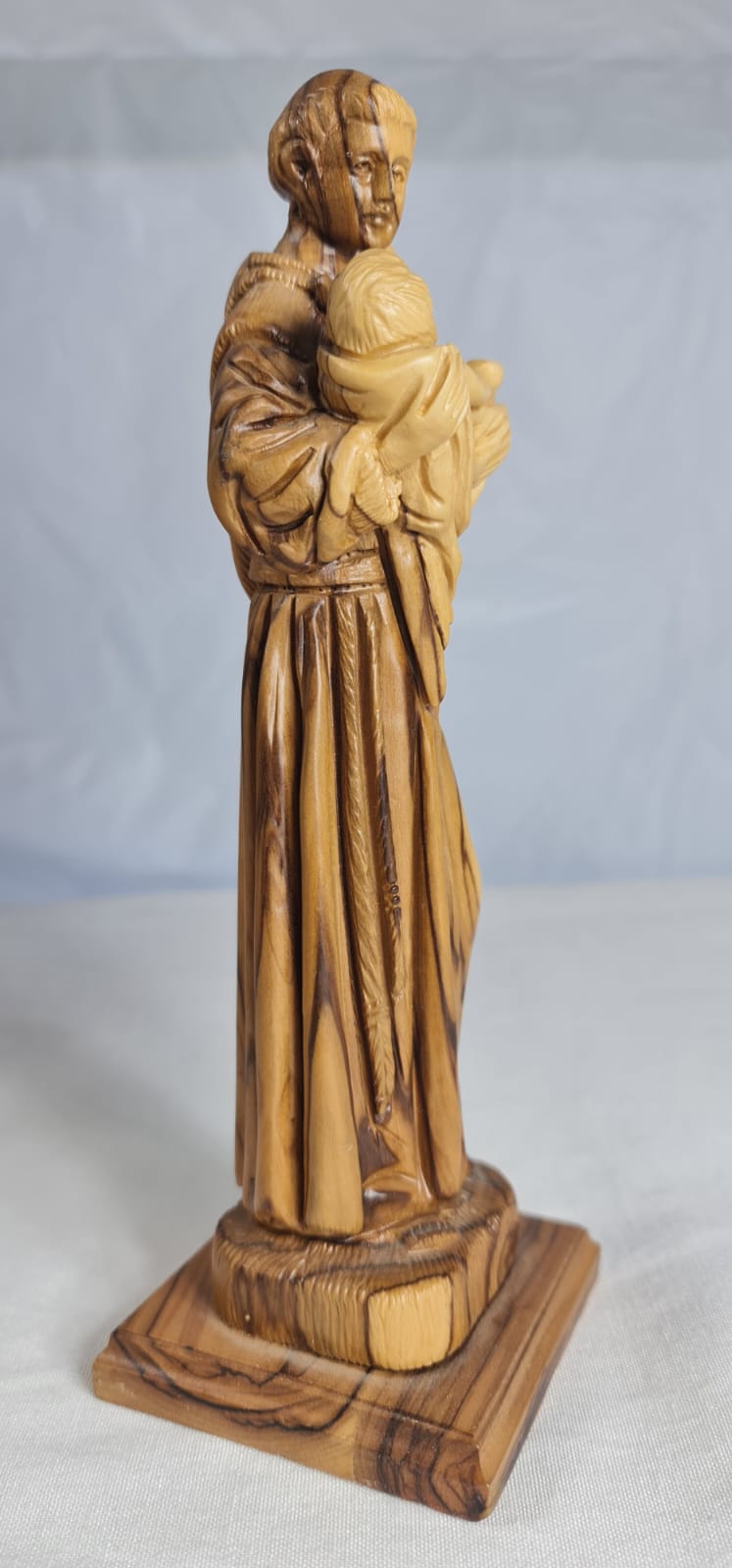 his is a hand-carved olive wood statue depicting Saint Anthony of Padua holding the Child Jesus. The statue is handcrafted from authentic olive wood, sourced from the Holy Land. It features Saint Anthony in his Franciscan habit, holding the Infant Jesus, a common representation of the saint.