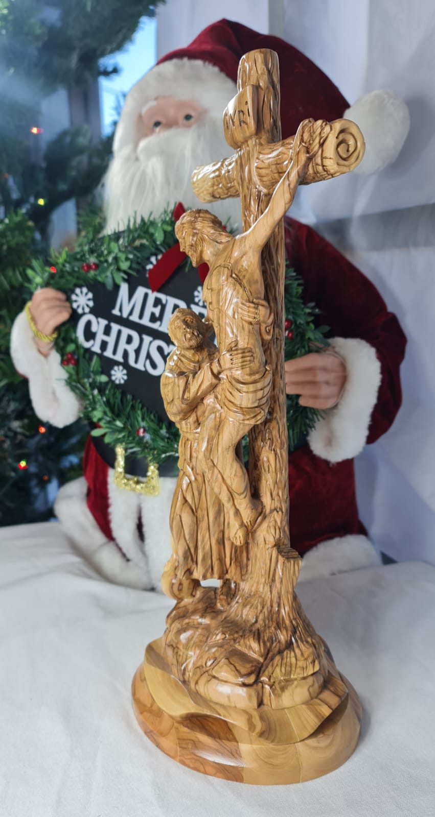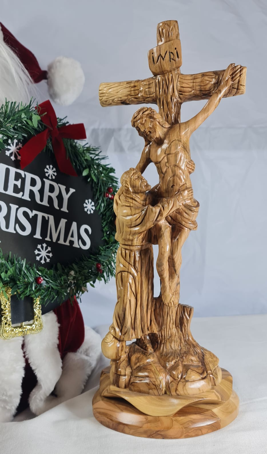 A Beautiful hand-carved olive wood statue depicting Saint Francis of Assisi embracing the crucified Christ.